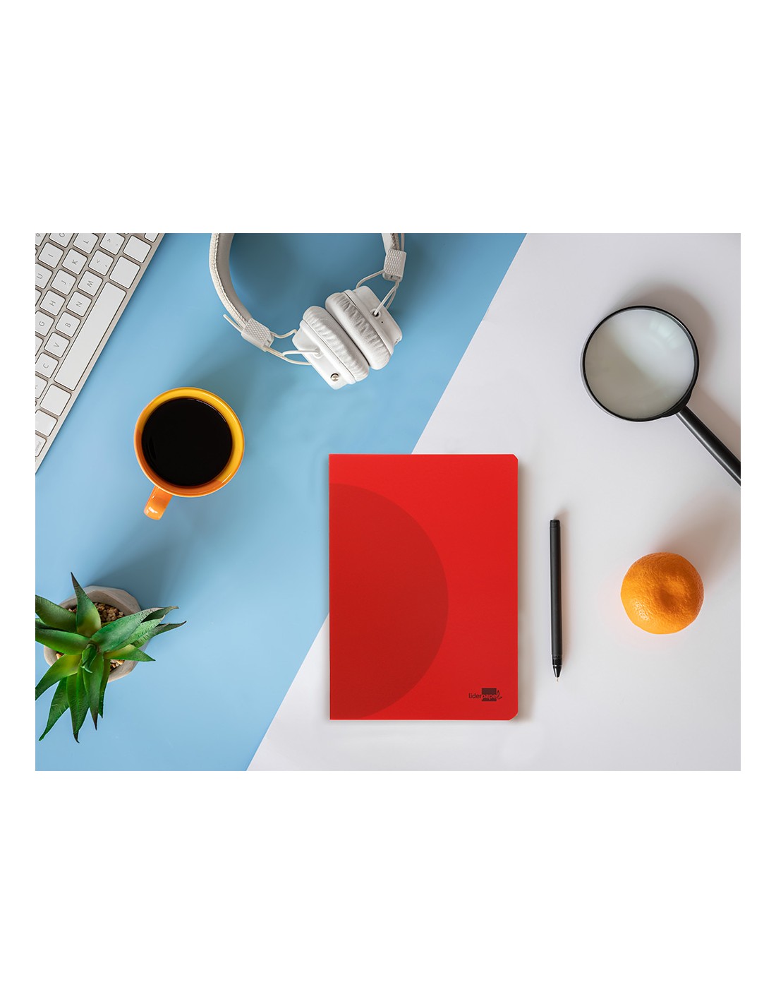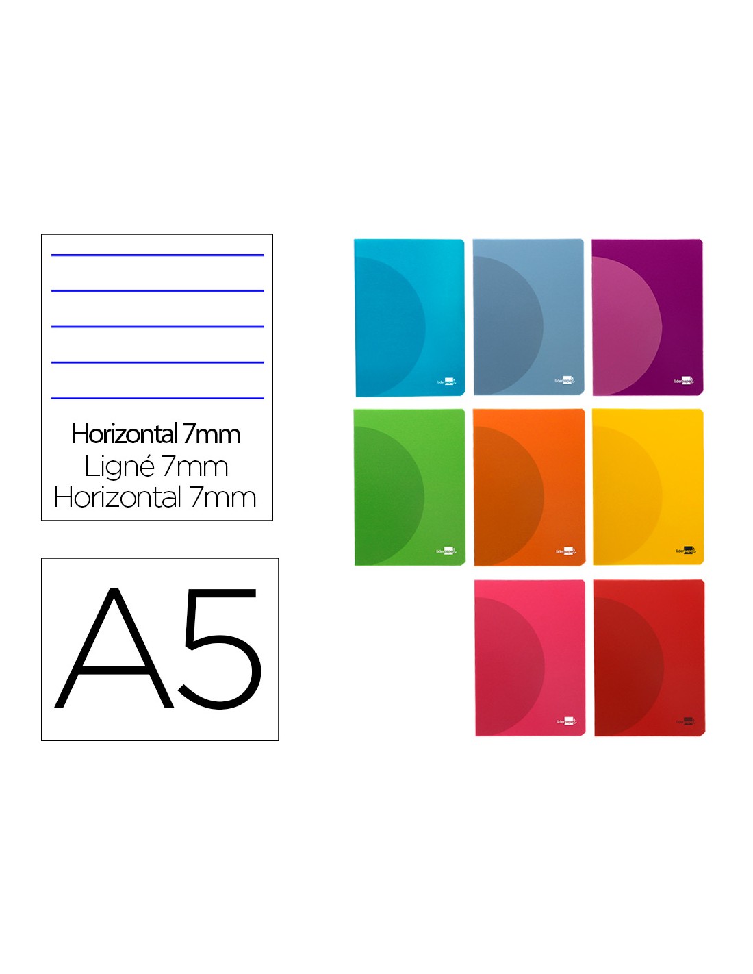 Llibreta amb tapa de plàstic flexible i resistent. Es pot obrir completament per a més comoditat. 48 fulles. Paper de 90 g/m². Ratllat horitzontal. Doble marge. Colors assortits.
