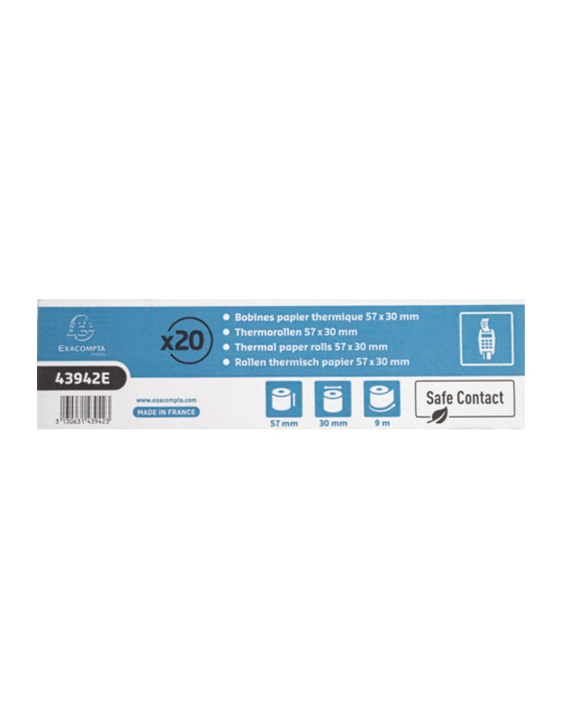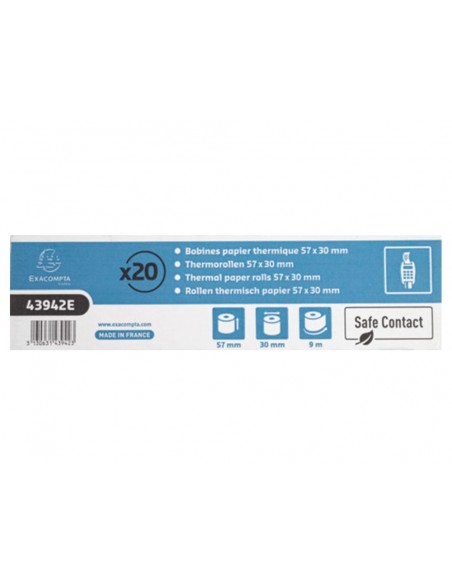 Rotlle de sumadora Tèrmic Safe Contact. 57 mm ample i diàmetre 30 mm (9 metres). Per a TPV (Targetes de Pagament Visa). Les bobines Safe contact estan fabricades amb un paper lleugerament blau grisenc que no tem la calor, la llum o la humitat, cosa que garanteix una impressió duradora (mínim 35 anys). Fabricades sense revelats químic, sense BPA i sense Fenol, les bobines Safe Contact són segures per a la salut i fins i tot estan aprovades per al contacte amb aliments. Aquest paper eco-responsable és reciclable amb residus de paper- Vida molt llarga, certificat FSC amb impressió a la part posterior r.