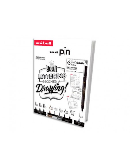 PIN és un retolador calibrat Punta de poliacetal Tinta pigmentada de gran resistència a l',aigua, que fa que un cop seca, no es pugui esborrar Ideal per al dibuix professional, artístic i per a l',escriptura, oferint un traç nítid i suau alhora. Kit d',iniciació al Lettering que inclou l',essencial per començar. Una selecció de 8 puntes Uni Pin calibrades, un p ortamines Shalaku S i 3 tutorials pas a pas amb explicacions detallades. Aprèn a crear compsicions, dibuixes lletres i decorar-les. Ideal per a REGALO!