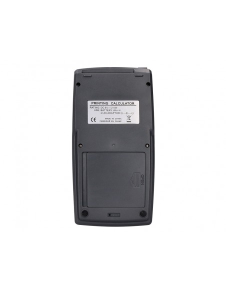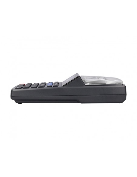 Calculadora impressora amb pantalla de 12 dígits. Utilitza rotlle de paper de 57 mm d',amplada per 25 mm de diàmetre. Imprimeix una tinta blava. Amb tecla de memòria, arrodoniment, tecla doble zero, tecla programable dimpostos, marge de benefici, preu de cost i preu de venda. Funciona amb 4 piles AA o amb adaptador de 6V 0,5a. Piles incloses. Compatible AMB GENOLL entintat codi 44293. Mides 98 x 192 x 44 mm. Pes 338 g.