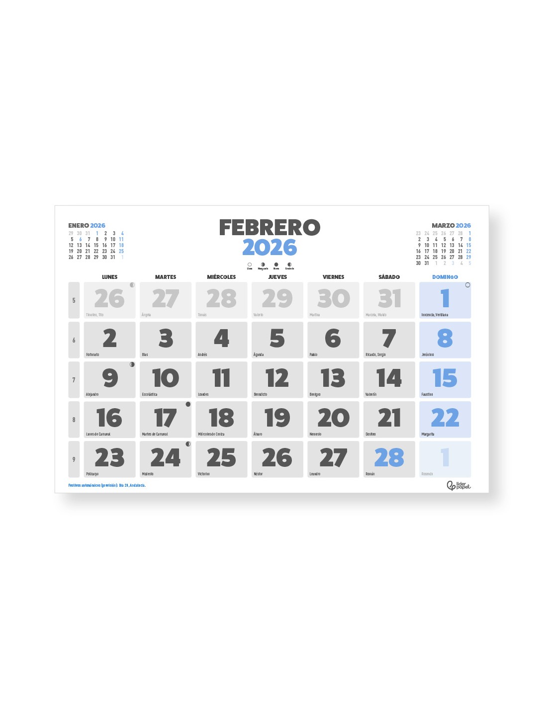Calendari paret liderpapel clàssic 2026 llom engomat 44x32 cm paper 128 gr