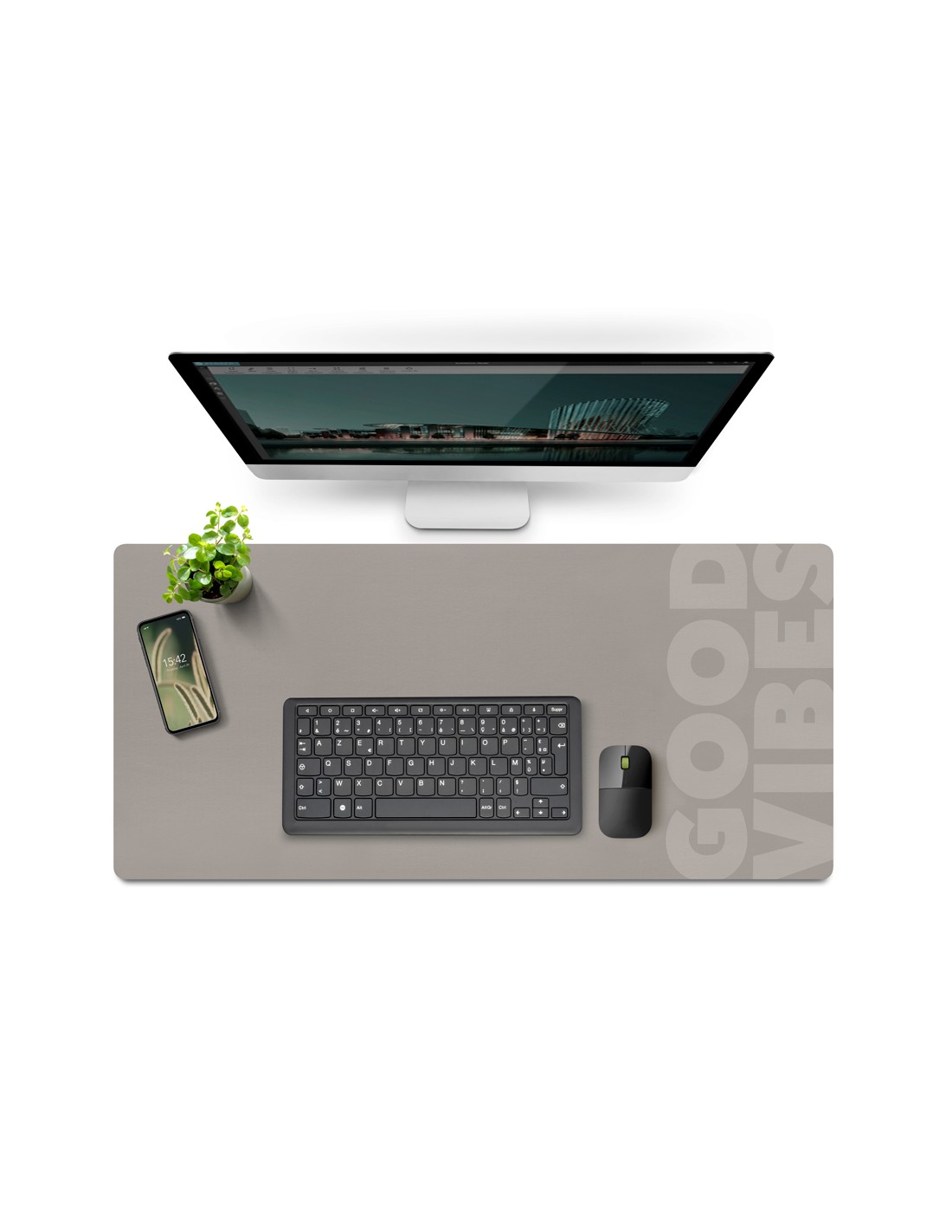 Un coixinet d',escriptori amb un disseny modern i elegant que aporta un bonic acabat al vostre escriptori. Gran format per guardar teclat, ratolí, smartphone i qualsevol accessori que vulgueu tenir a mà. Superfície suau al tacte per a una sensació agradable. Perfectament llisa per a un funcionament òptim de qualsevol tipus de ratolí. Protegeix el seu escriptori d',esgarrapades. Acabat mat antireflexos. Part inferior d',escuma suau antilliscant. Es pot rentar per ambdues cares amb aigua i sabó. PVC sense ftalats. Imprès amb tintes sense dissolvents amb certificació Greenguard Gold. Mides 750 x 350 mm. Grossor 1,5 mm Color Sorra.