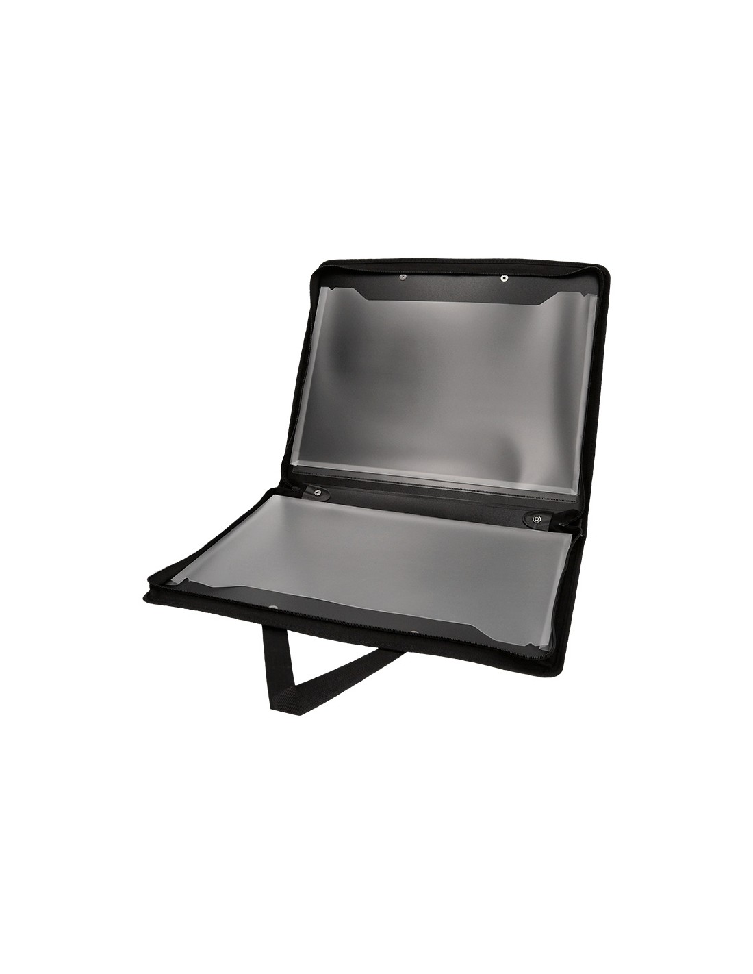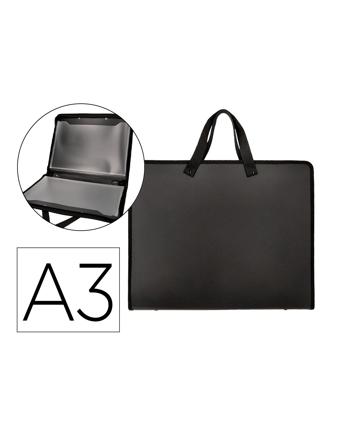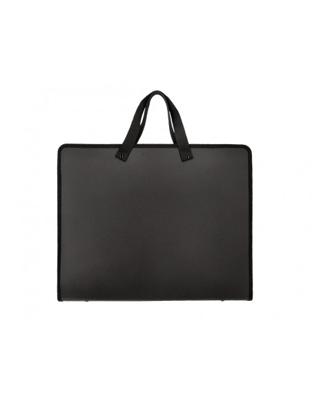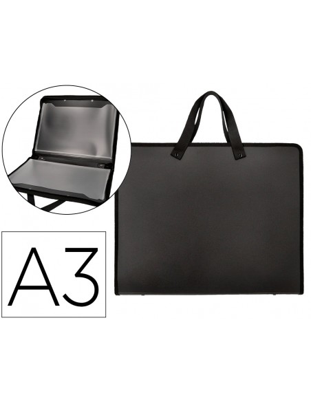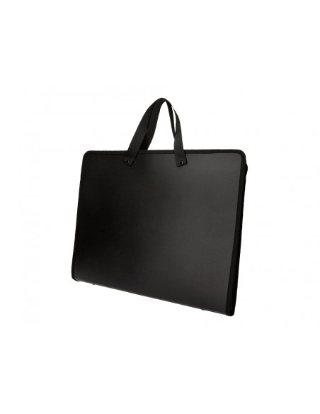 Fabricada amb polipropilè. Amb nanses de roba. Tancament amb cremallera. Dues butxaques interiors. 750 micres. 2 butxaques interiors de 200 micres. Ideal per a dibuix i disseny gràfic. Color negre. Format DIN A3.