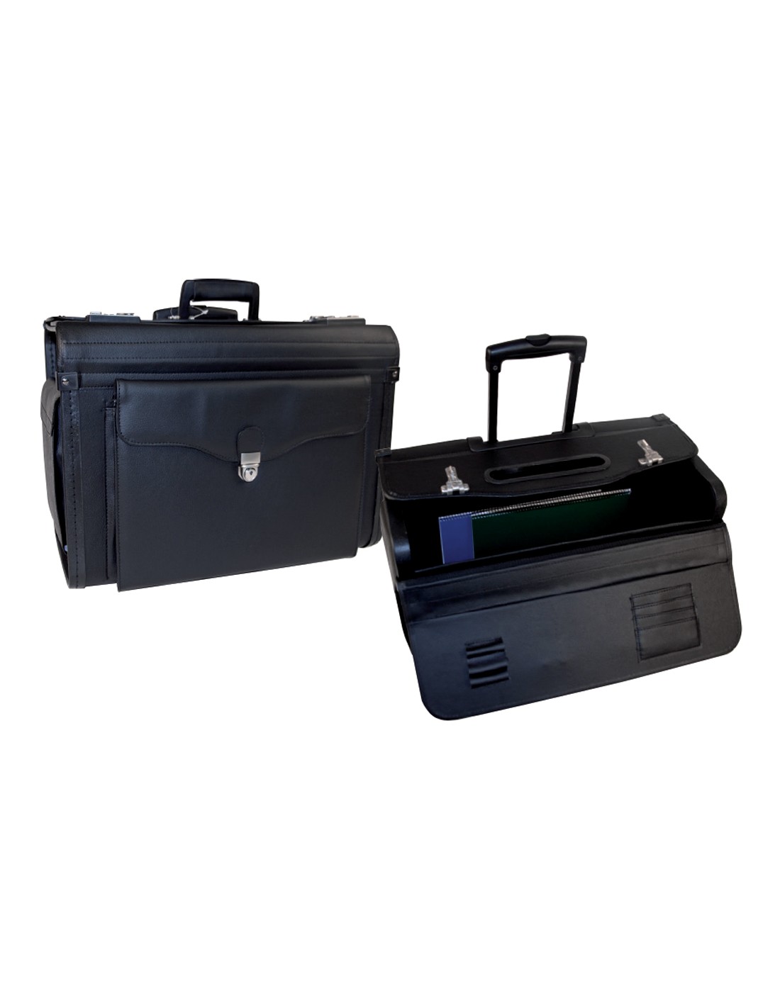 Maletí Attaché Pilot amb nansa extensible, rodes i pany amb combinació. Amplis compartiments interiors i compartiment lateral amb pany metàl·lic amb clau. Color negre amb detalls de plata. Mides 490 x 350 x 225 mm.