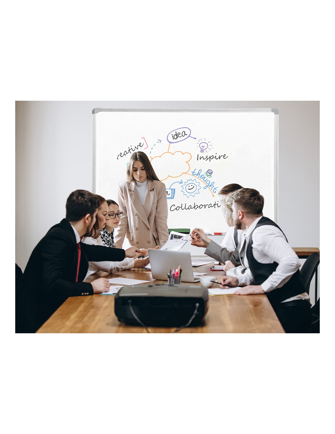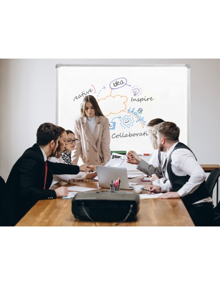 Superfície llisa. Amb marc dalumini. Utilitzar només retoladors especials per a pissarra BLANCA. Safata inclosa. Adaptable a format vertical. Proveïda d'accessoris de fixació a la paret.