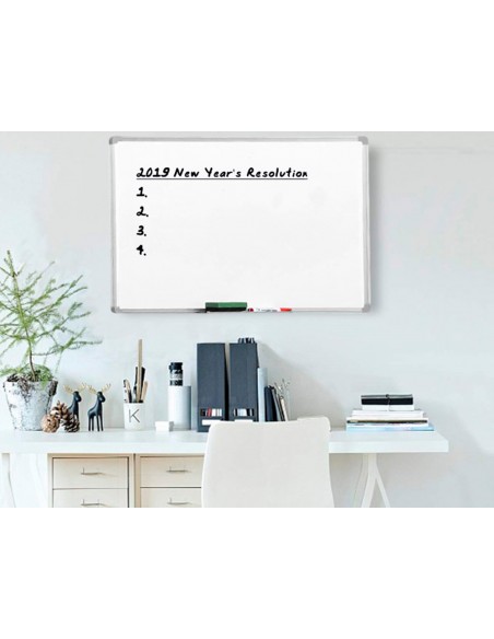 Superfície llisa. Amb marc dalumini. Utilitzar només retoladors especials per a pissarra BLANCA. Safata inclosa. Adaptable a format vertical. Proveïda d'accessoris de fixació a la paret.
