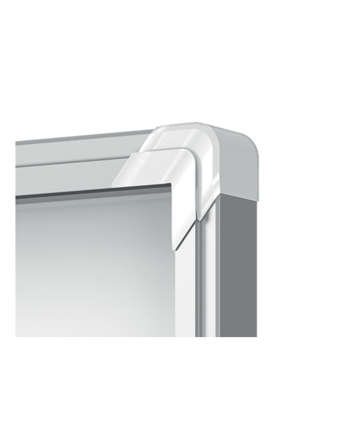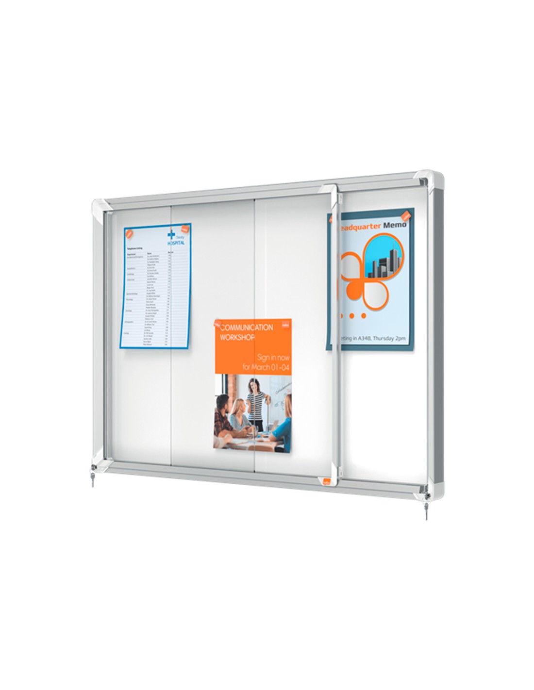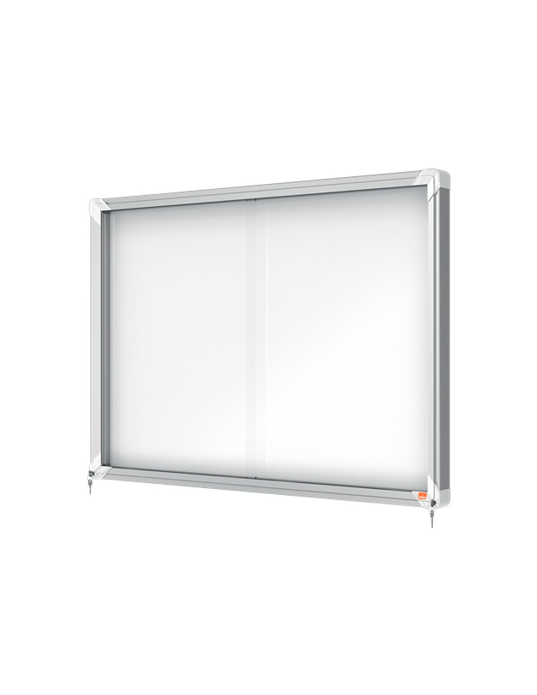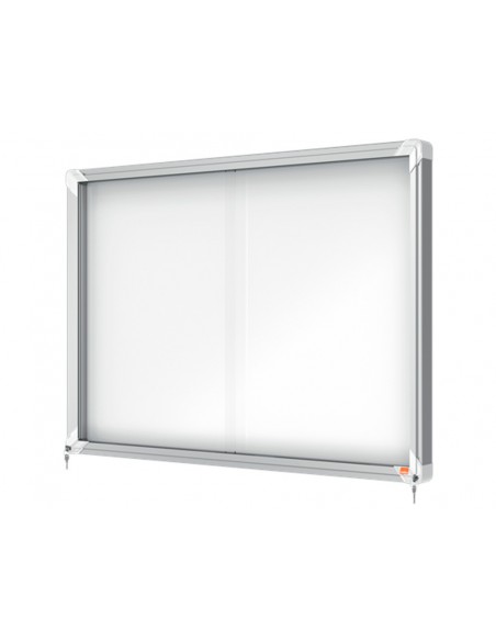 Vitrina amb pany per a interiors amb superfície BLANCA magnètica d'esborrat en sec i porta de seguretat de vidre de 4 mm de gruix. Les portes lliscants de la vitrina són ideals per a passadissos o llocs amb poc espai on una porta convencional amb frontiss