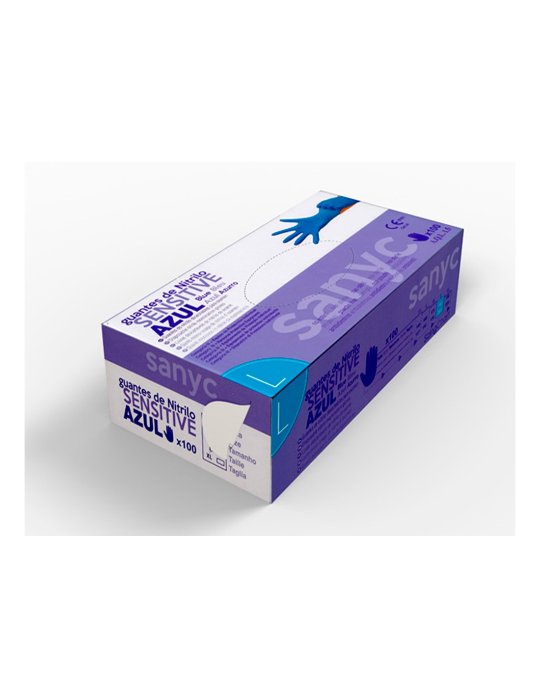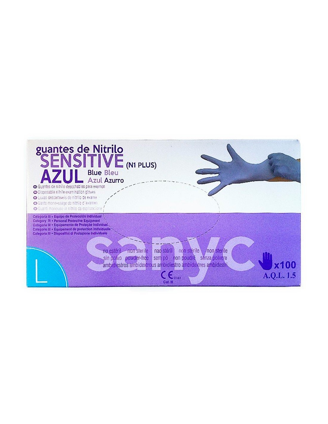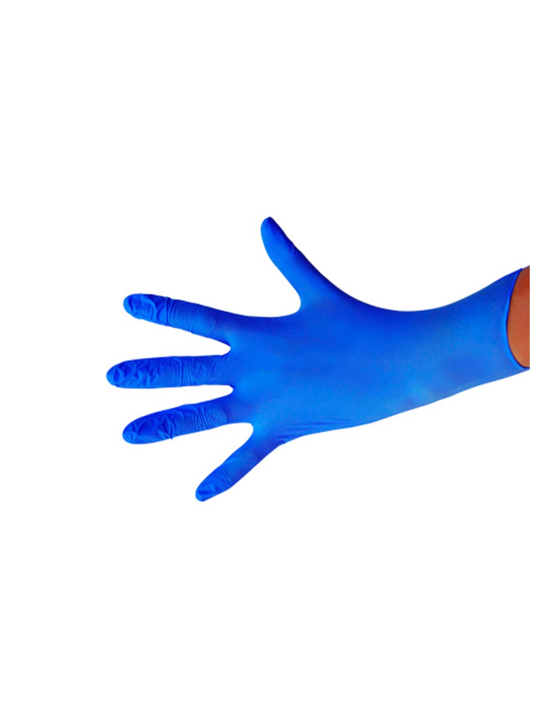 Guant 100% de nitril sensitive en color blau, totalment mancat de pols lubricant. Texturitzat als rovells dels dits, el puny amb rivet assegura una fàcil col·locació i preveu que s',enrotlli. Ambidestre.