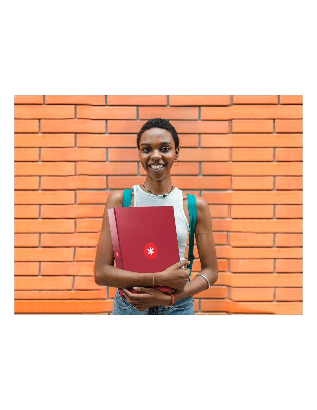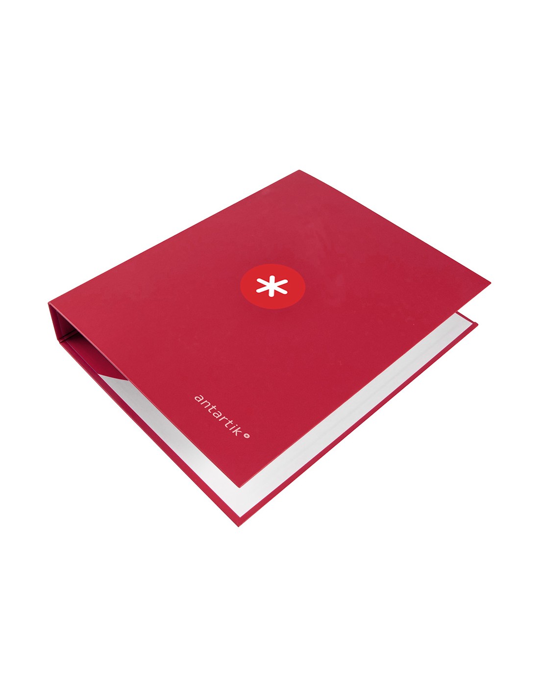 Carpeta fabricada en cartón forrado de 1,5 mm de espesor. Forrada en papel estucado de 135 g/m² impreso. Plastificada mate con detalles en barniz UVI. Con 4 anillas de 40 mm. Guarda interior impresa. Formato DIN A4.