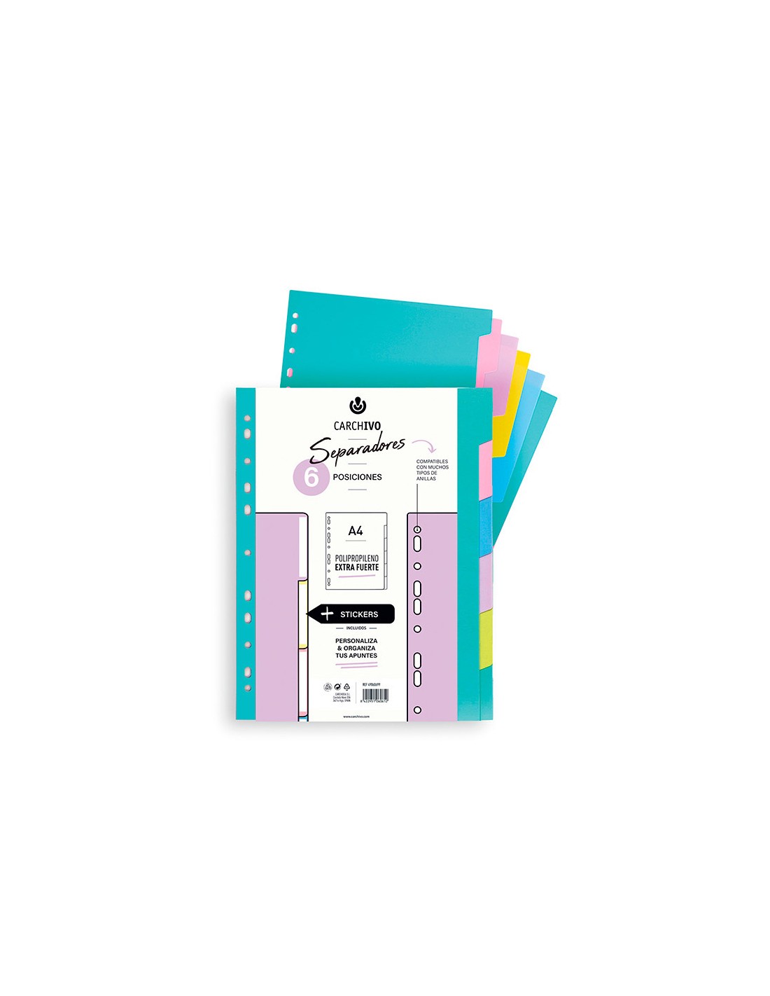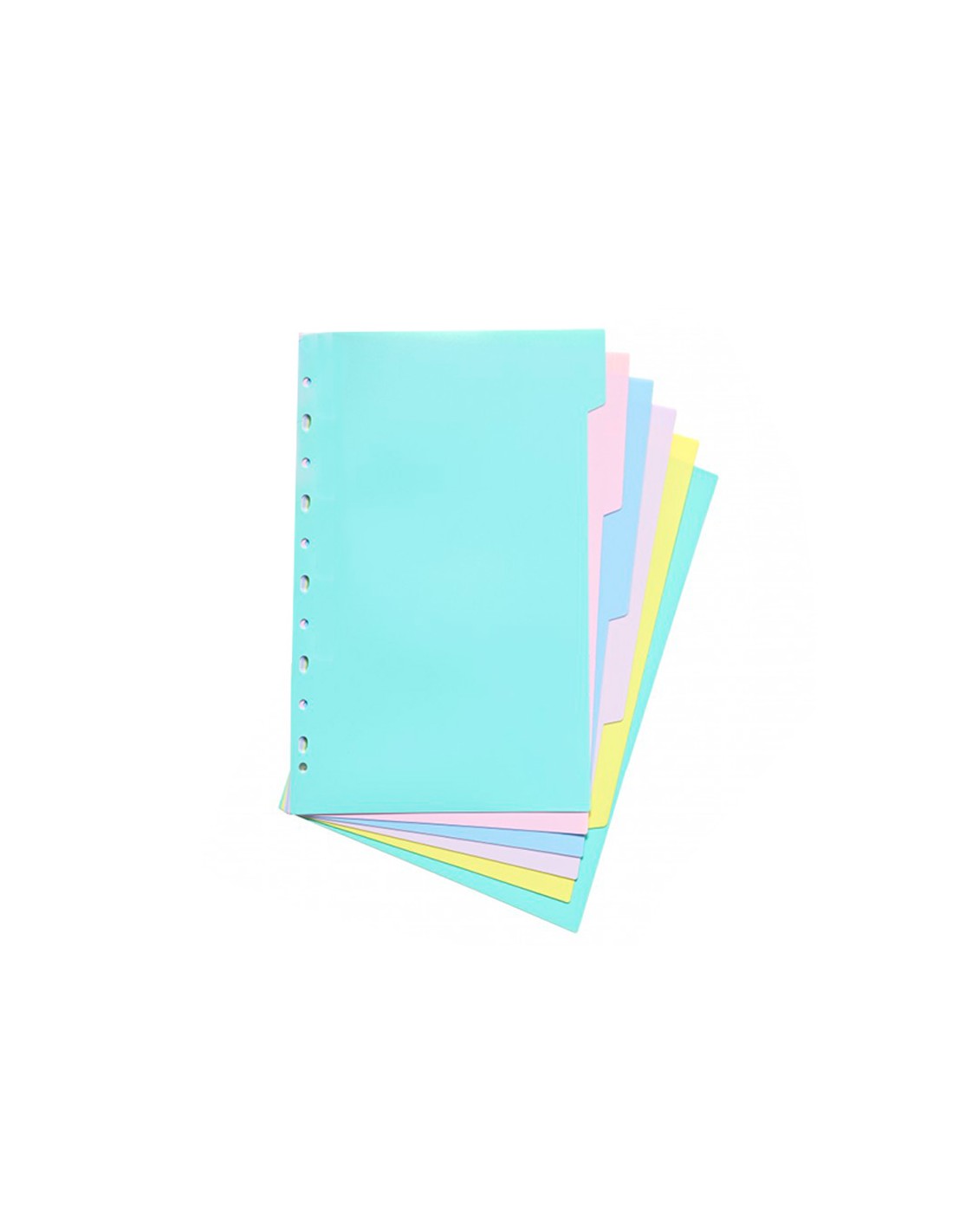 Separadores de colores en polipropileno extrafuertes. Mutitaladro. Juego de 6 separadores. Colores pastel. Formato DIN A4.