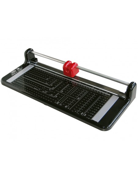 Máquina cortadora con base fabricada en poliestireno resistente a los golpes. Robusta y con medidas grabadas en centímetros, pulgadas y resto de formatos habituales. Cabezal de seguridad que protege la cuchilla. Precisa y fácil de utilizar. Color negro. Permite el corte en ambos sentidos. Capacidad de corte 8 hojas. Longitud de corte 320 mm (DIN A4). Medidas 390 x 57 x 160 mm.