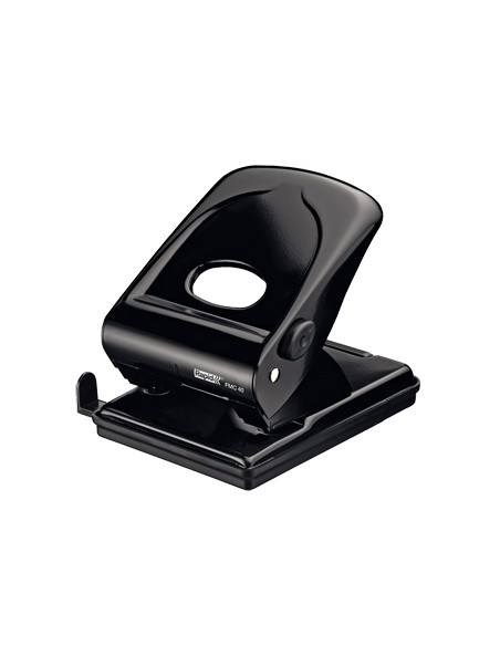 Potente taladro de metal equipado con bloqueo de la palanca para facilitar su almacenamiento. Tiene regleta tope para alinear el papel. Ideal para uso de oficina. Diámetro de punzones 5,5 mm. Capacidad de perforado 40 hojas. Color negro. Medidas de la base 69 x 115 mm.