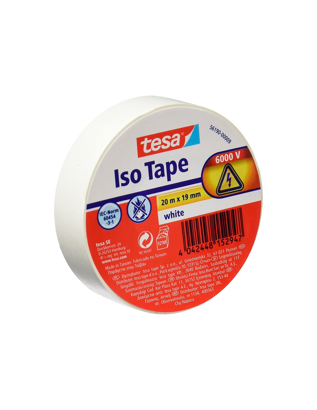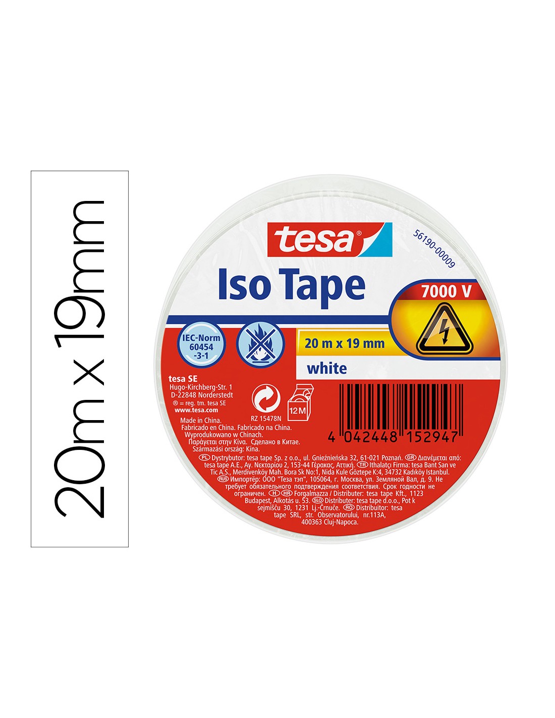 Cinta adhesiva aislante tesa 20 mt x 19 mm color blanco