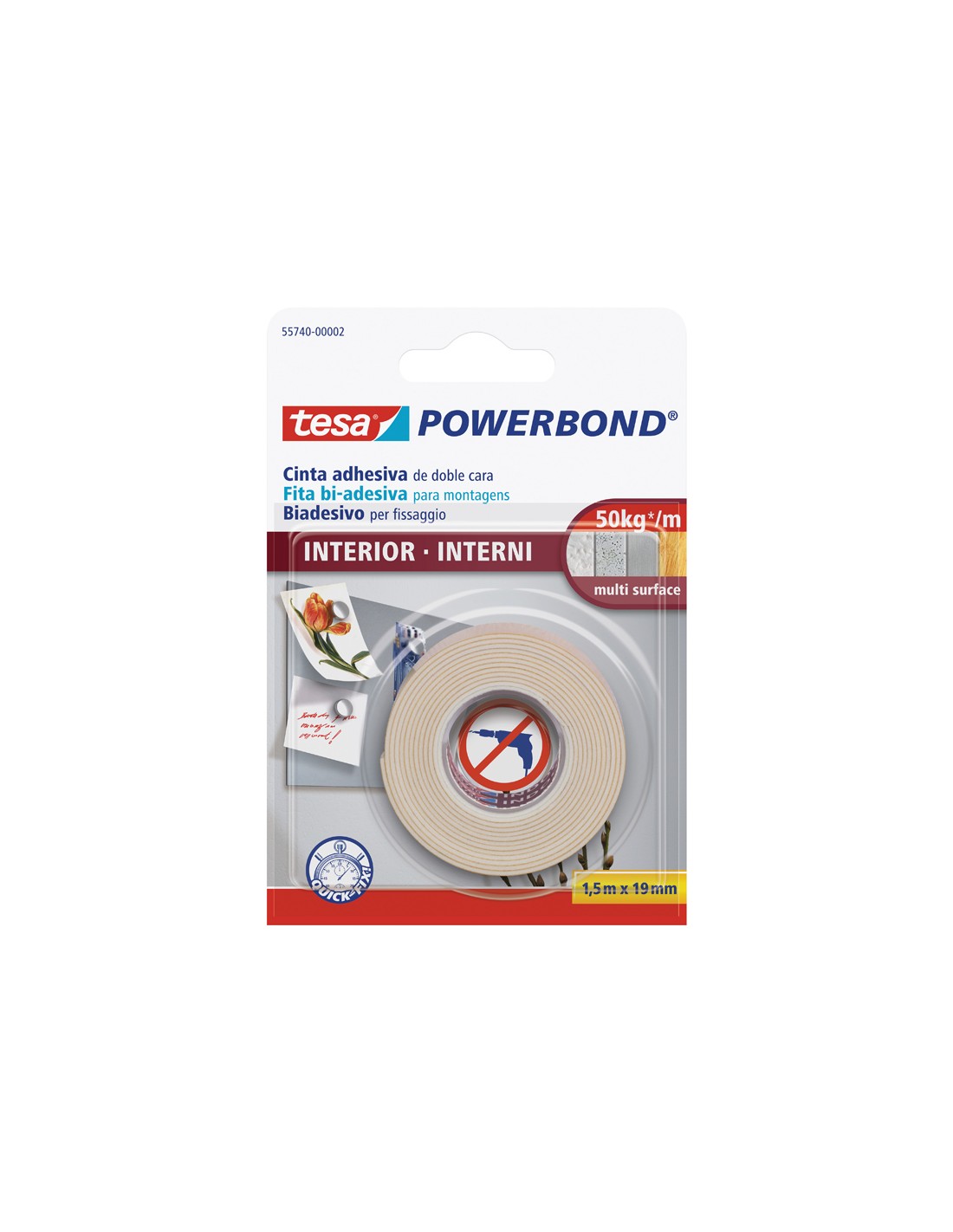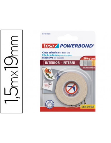Cinta adhesiva doble cara extrafuerte para una segura fijación en interiores. Medidas 1,5 m x 19 mm.