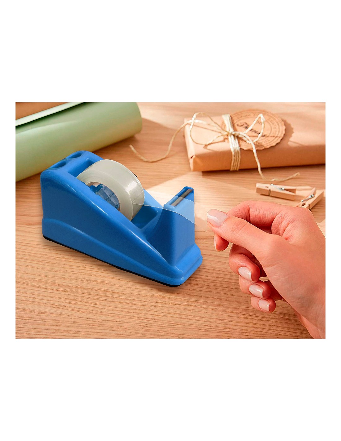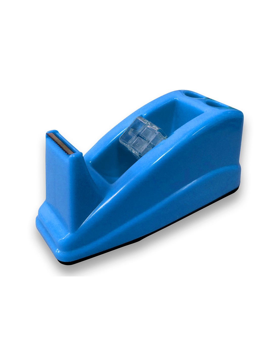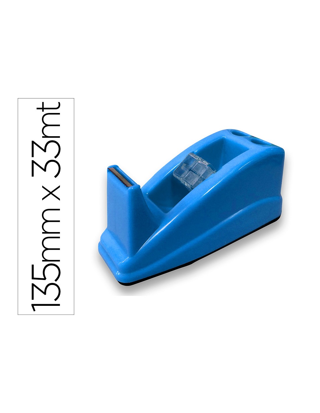 Portarrollos fabricado en plástico. Para cintas de hasta 33 m. Con soporte para 2 bolígrafos. Base antideslizante. Ideal para uso en oficinas y establecimientos de comercio. No incluye cinta. Medidas 135 x 60 mm.