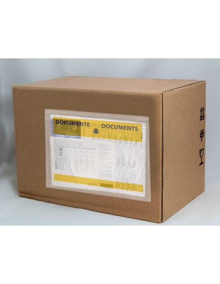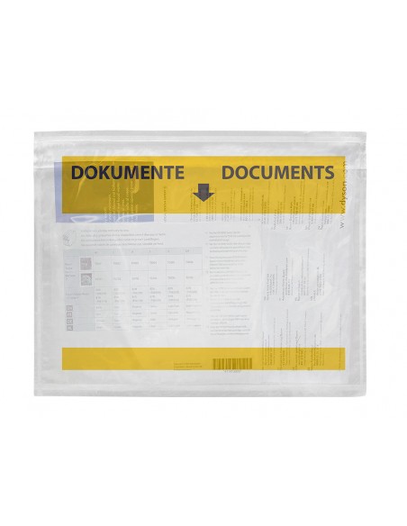Sobre autoadhesivo para el envío de documentos. Texto en inglés y alemán. Totalmente transparente, sin ventana, con impresión en negro y amarillo.