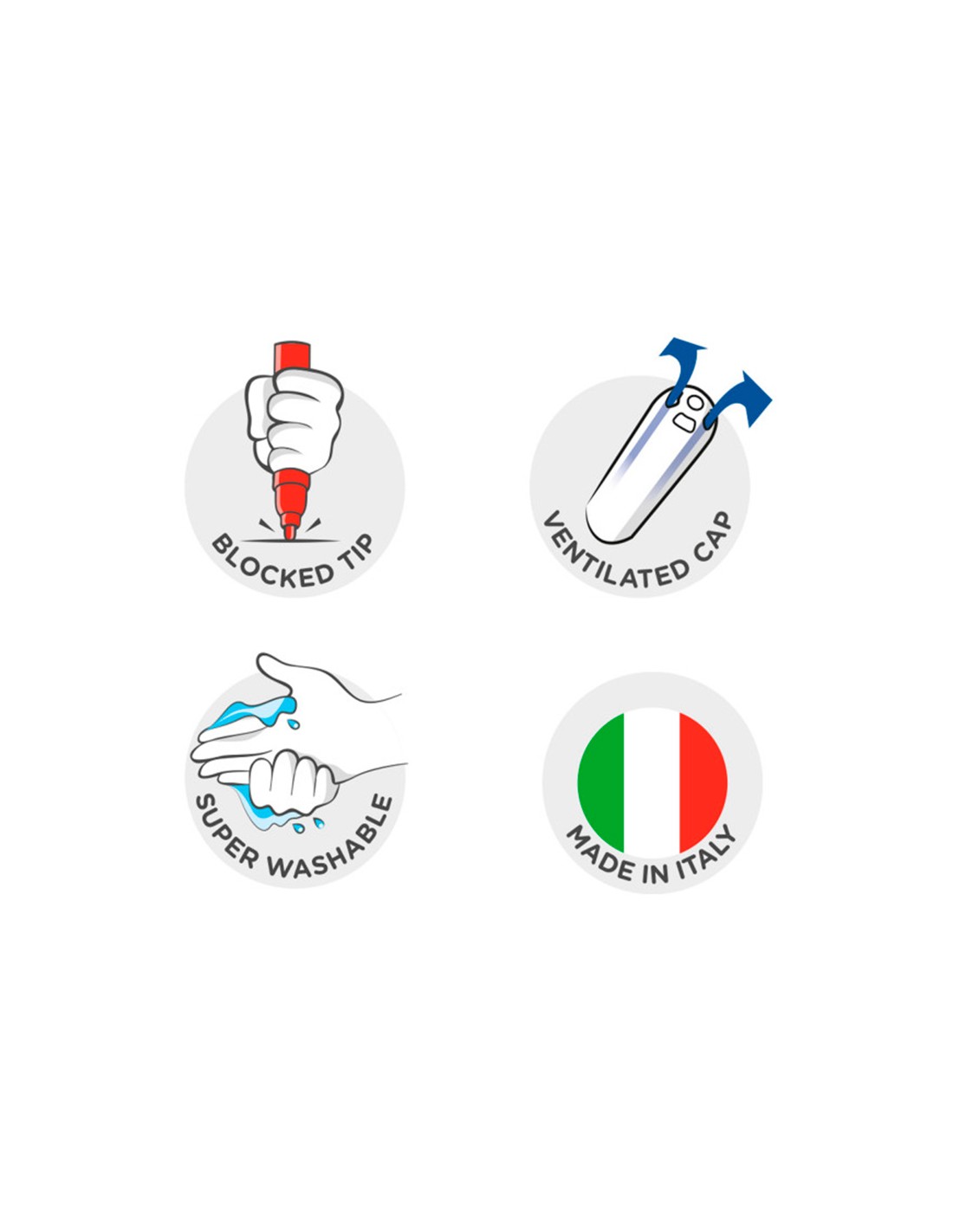 Punta de nylon de 2,6 mm de diámetro. Tinta a base de agua y colorantes alimentarios inocuos y lavables. Punta bloqueada. Permite hasta 800 m de escritura. Sin gluten.