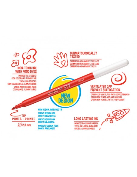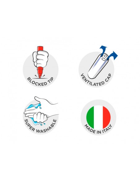Punta de nylon de 2,6 mm de diámetro. Tinta a base de agua y colorantes alimentarios inocuos y lavables. Punta bloqueada. Permite hasta 800 m de escritura. Sin gluten.