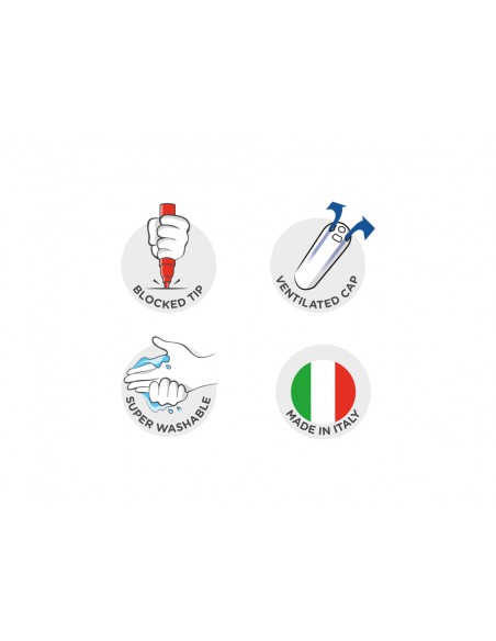 Punta de nylon de 2,6 mm de diámetro. Tinta a base de agua y colorantes alimentarios inocuos y lavables. Punta bloqueada. Permite hasta 800 m de escritura. Sin gluten.