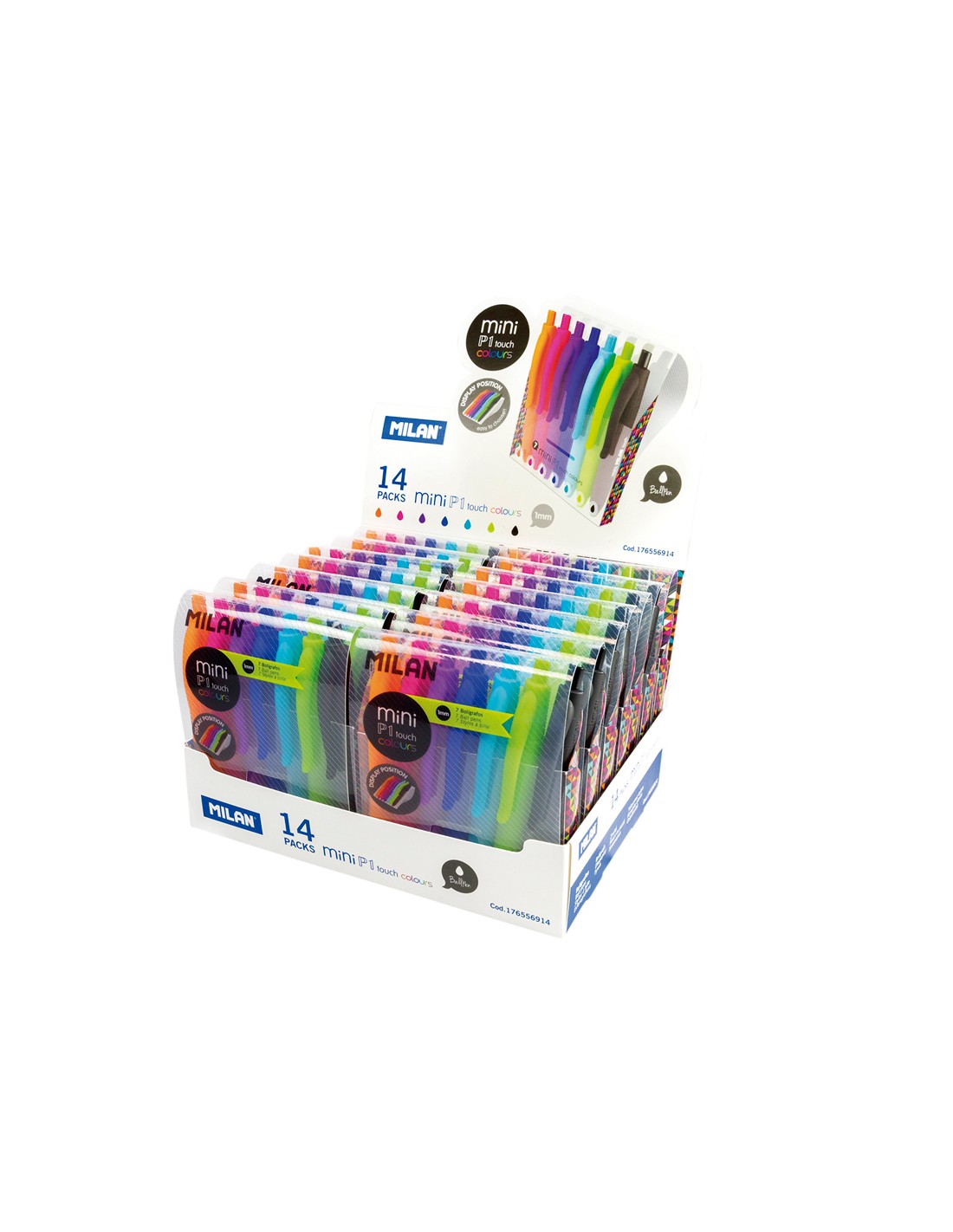 Boligrafo milan p1 retractil 1 mm touch mini estuche de 7 unidades colores surtidos expositor de 14 estuches