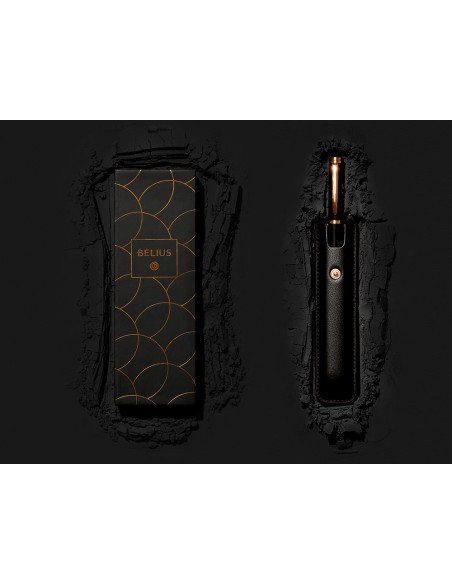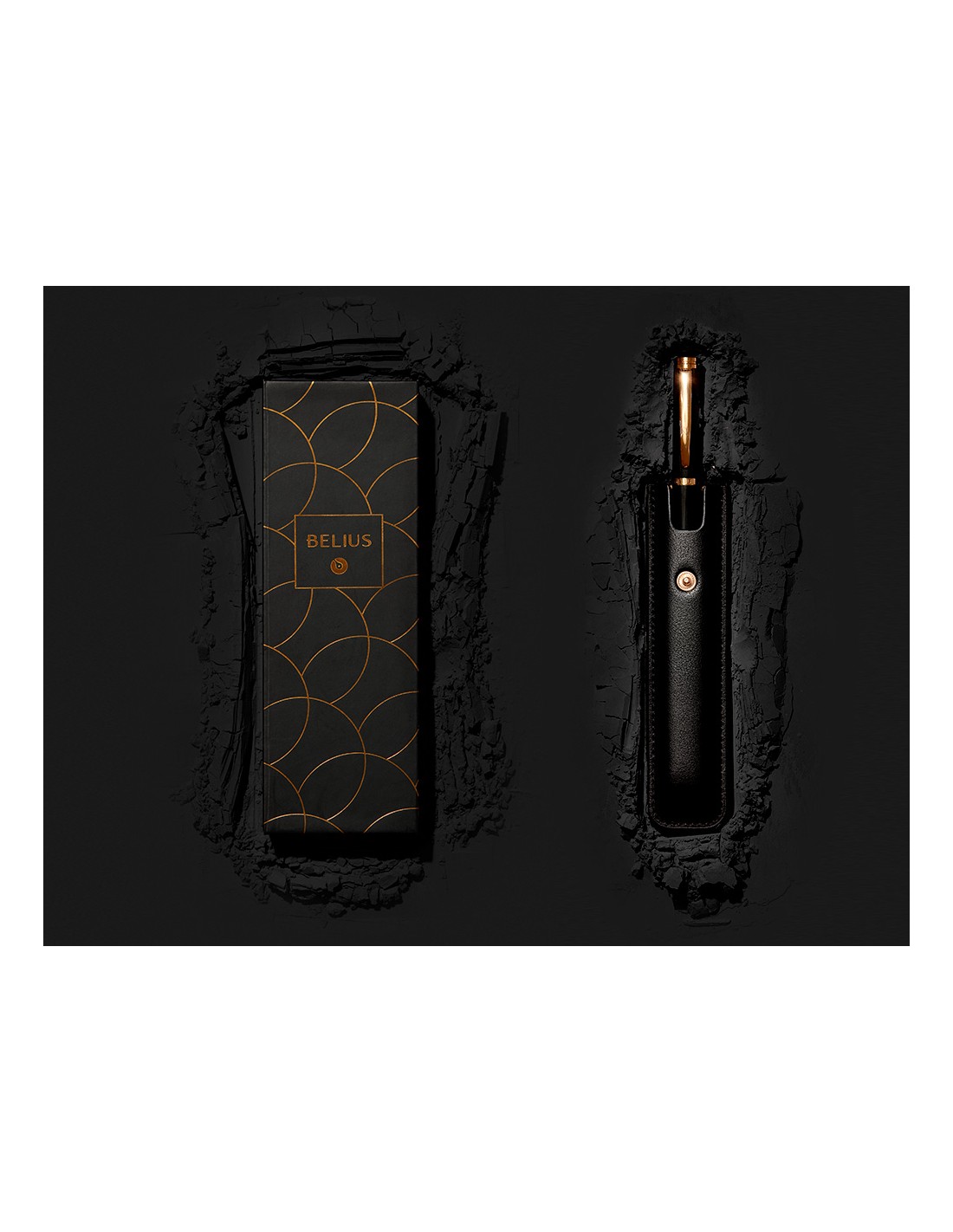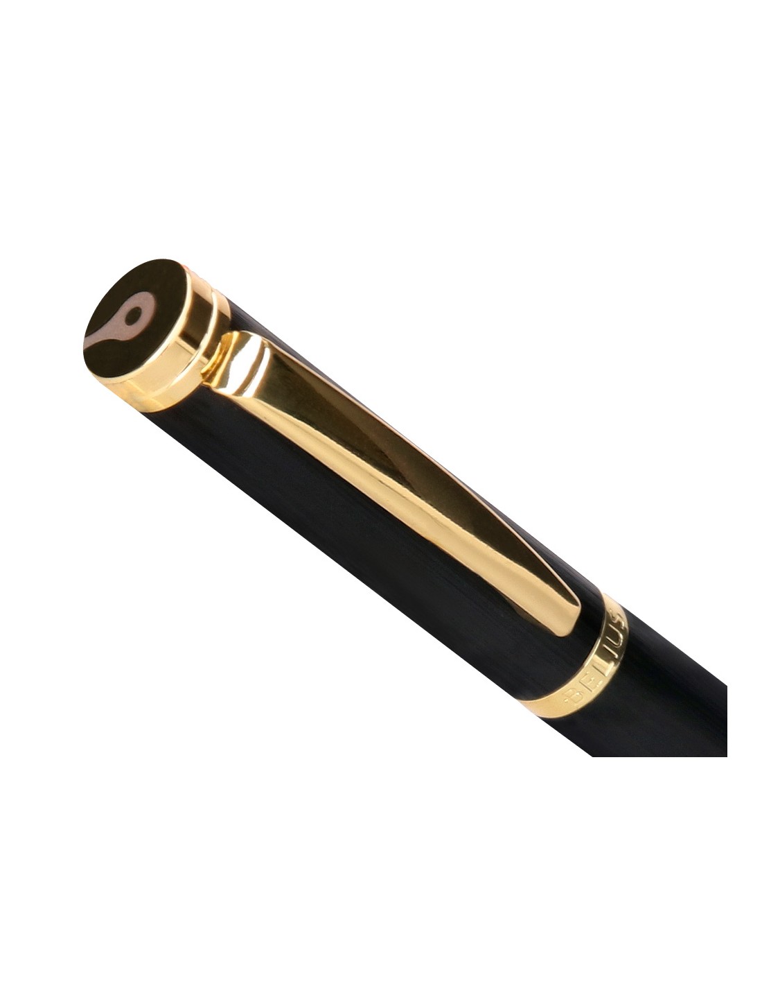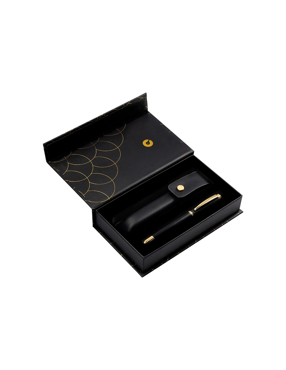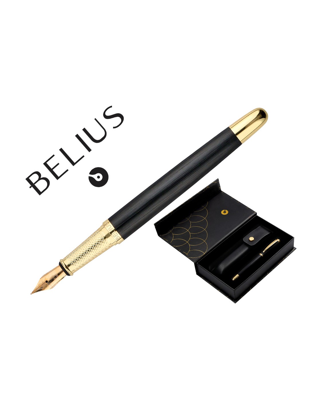 Pluma y estuche cuero belius passion dor aluminio textura cepillada color negro y dorado tinta azul caja diseño