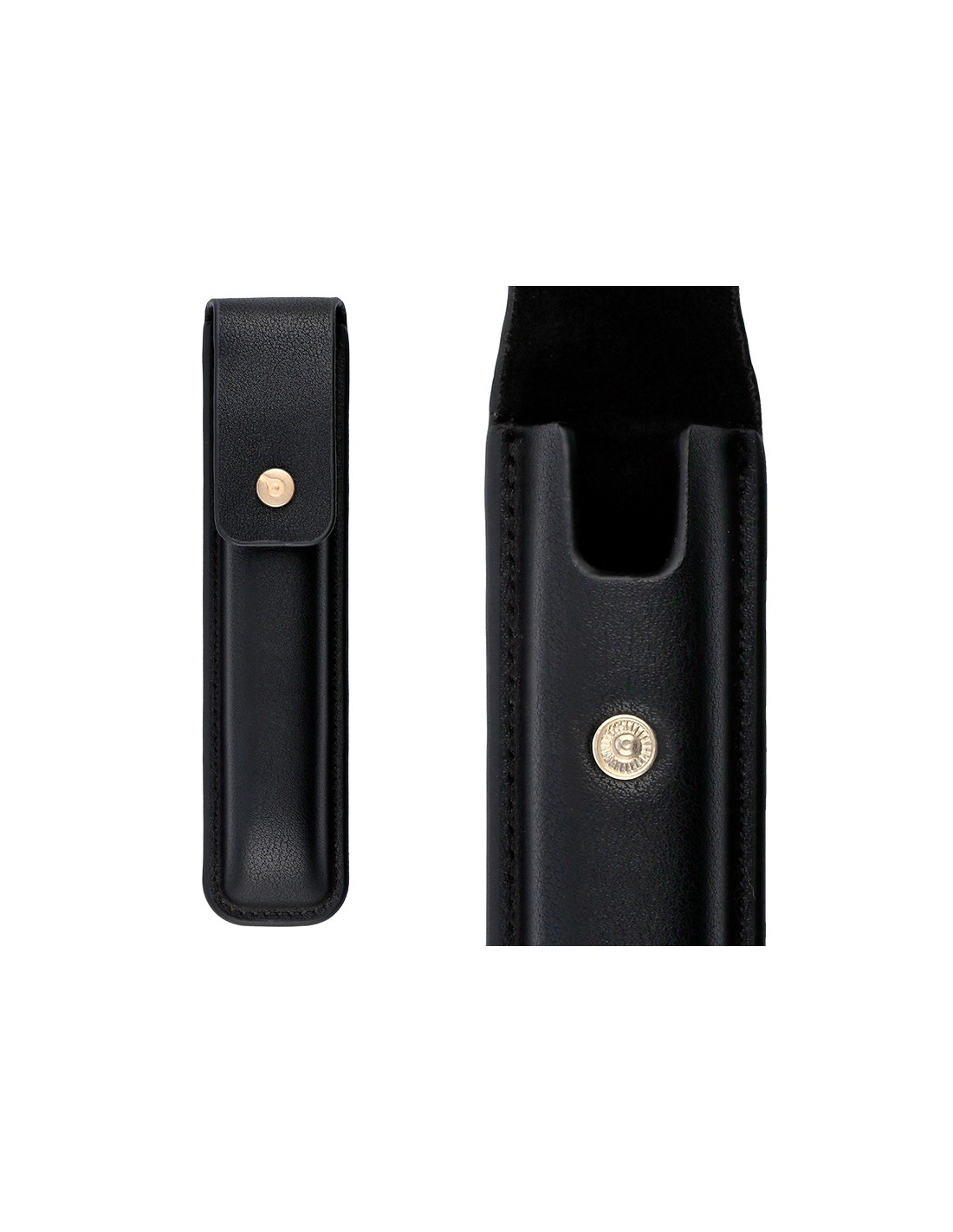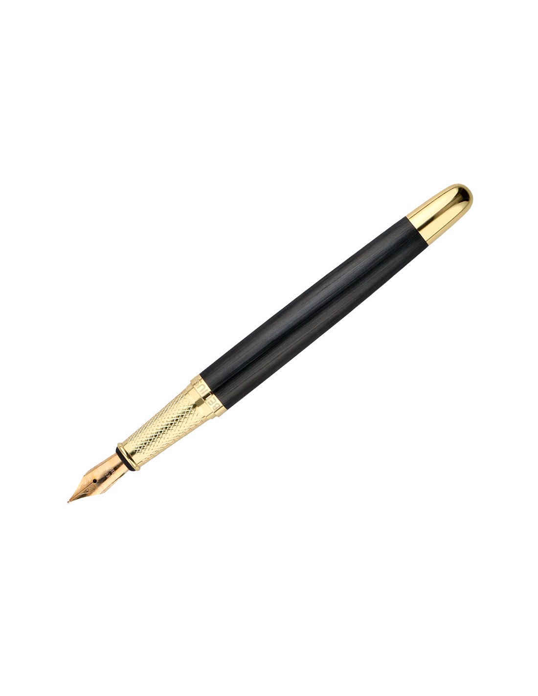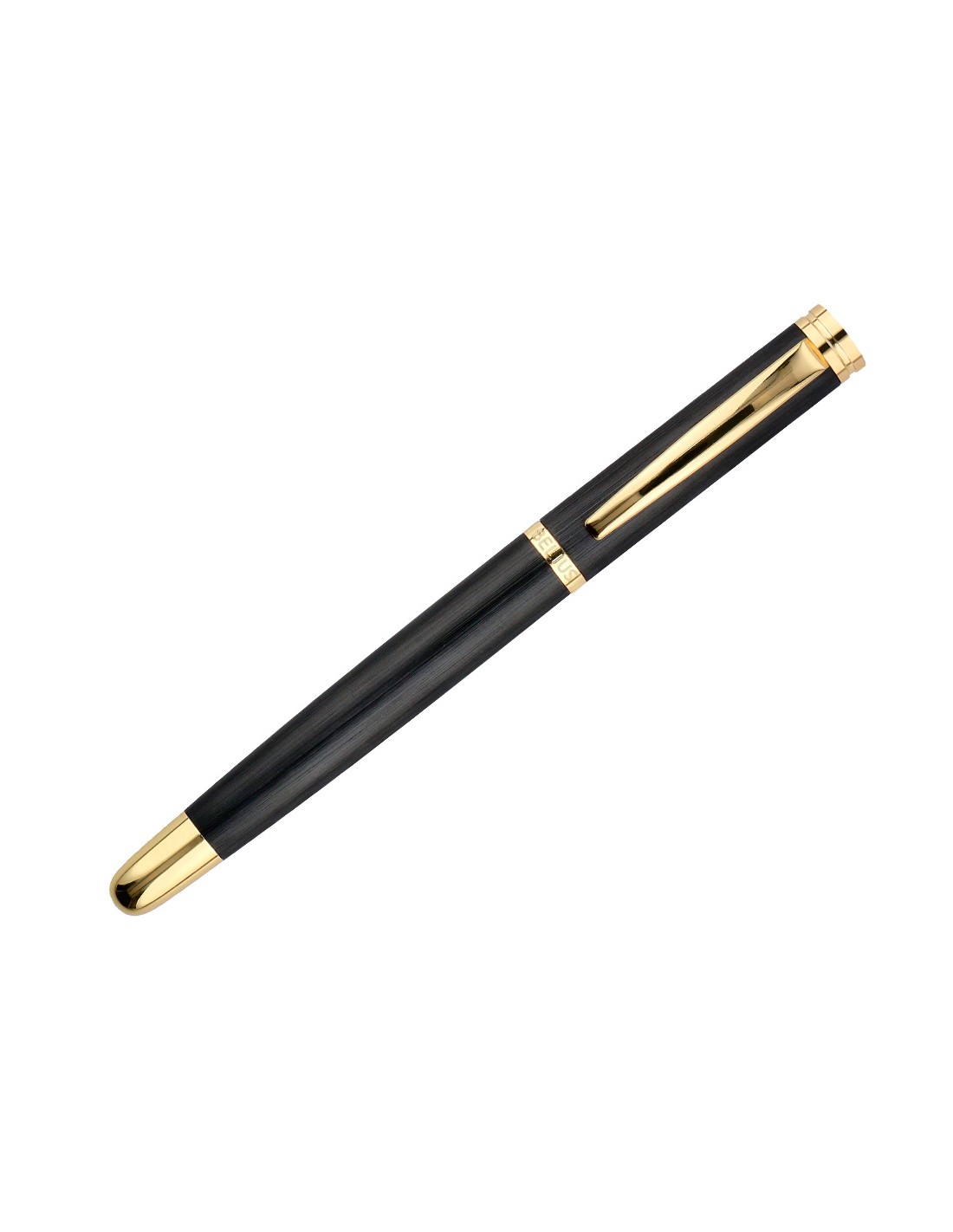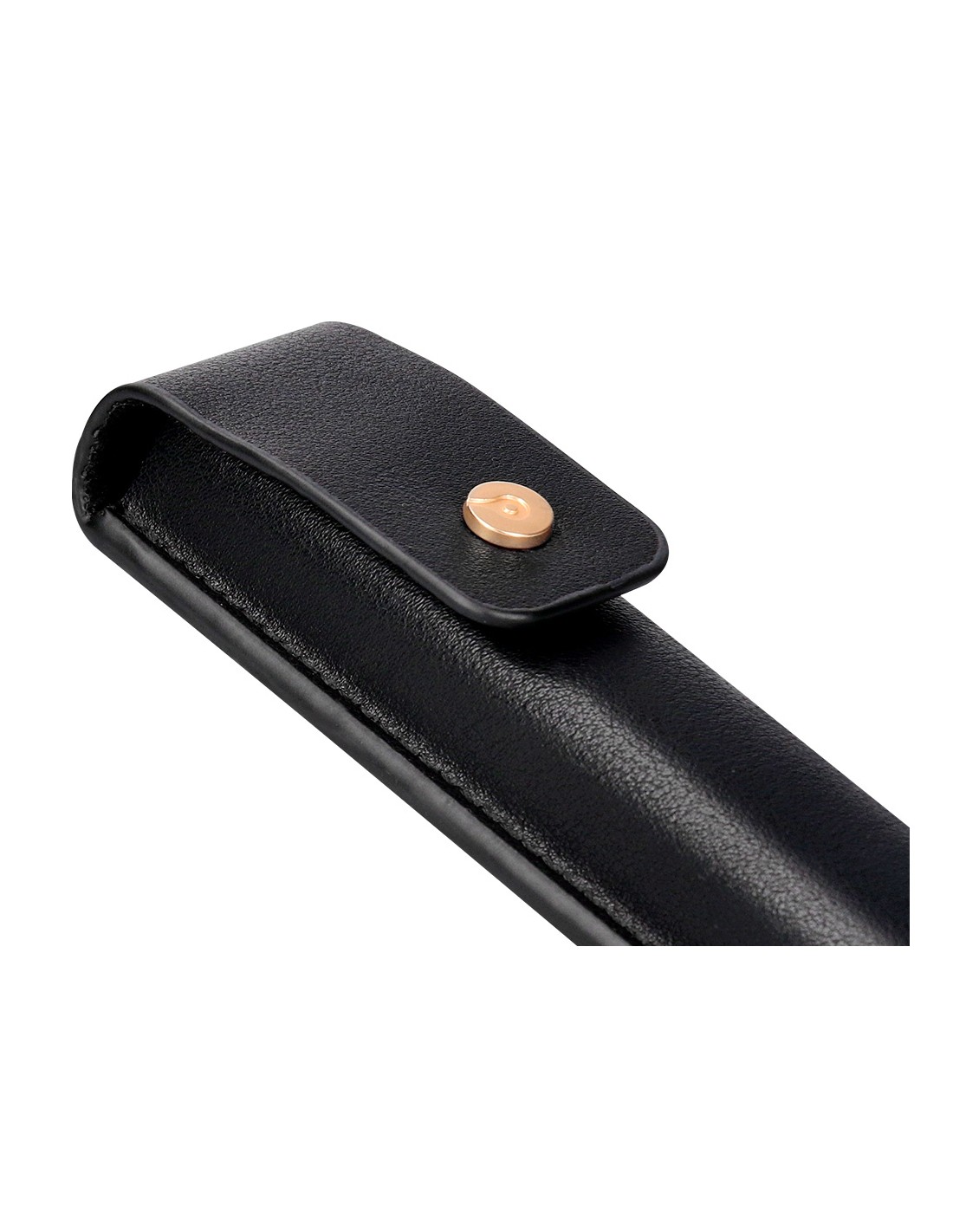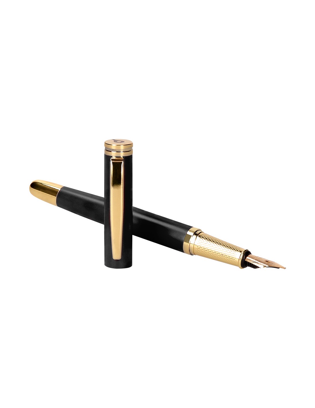 Pluma y estuche cuero belius passion dor aluminio textura cepillada color negro y dorado tinta azul caja diseño