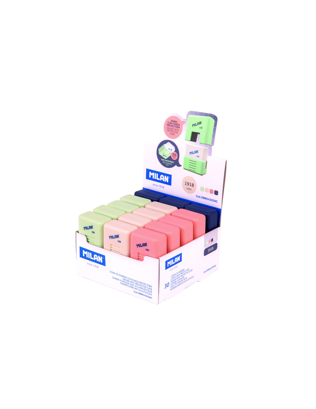 Goma de borrar milan 430 miga de pan con funda school serie 1918 expositor de 30 unidades surtidas