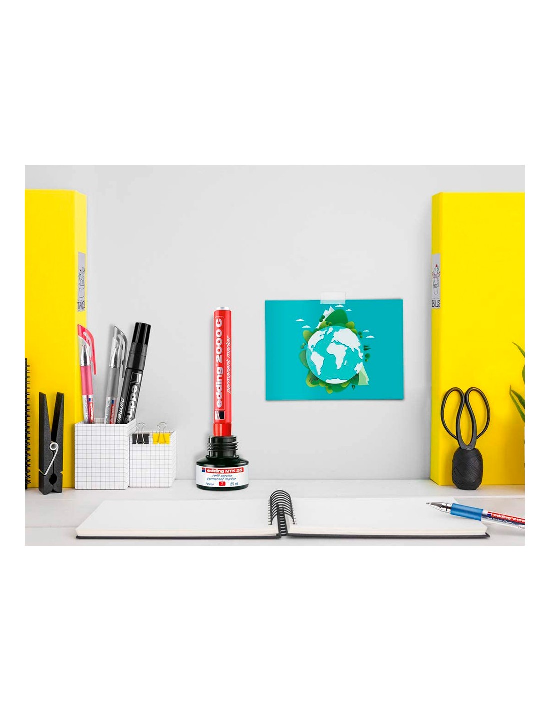 Tinta para rellenar con sistema capilar, ideal para rellenar de forma limpia y sencilla diversos marcadores permanentes edding. El frasco de recargade tinta contiene 25 ml. Simplemente hay que colocar la punta hacia abajo en el frasco de rellenado durante al menos una hora o, idealmente, durant e toda la noche. Y el marcador estará listo para volver a escribir. Sin adición de xileno ni tolueno. Color rojo