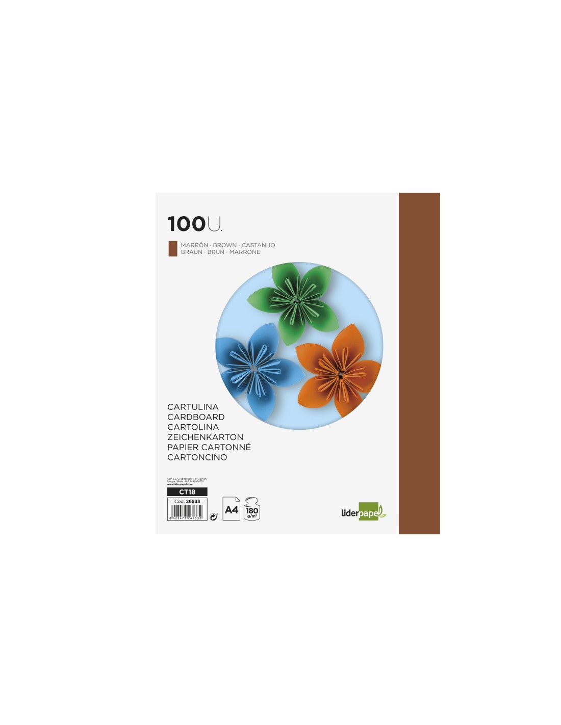 Cartulina liderpapel a4 180g/m2 marron paquete de 100 hojas