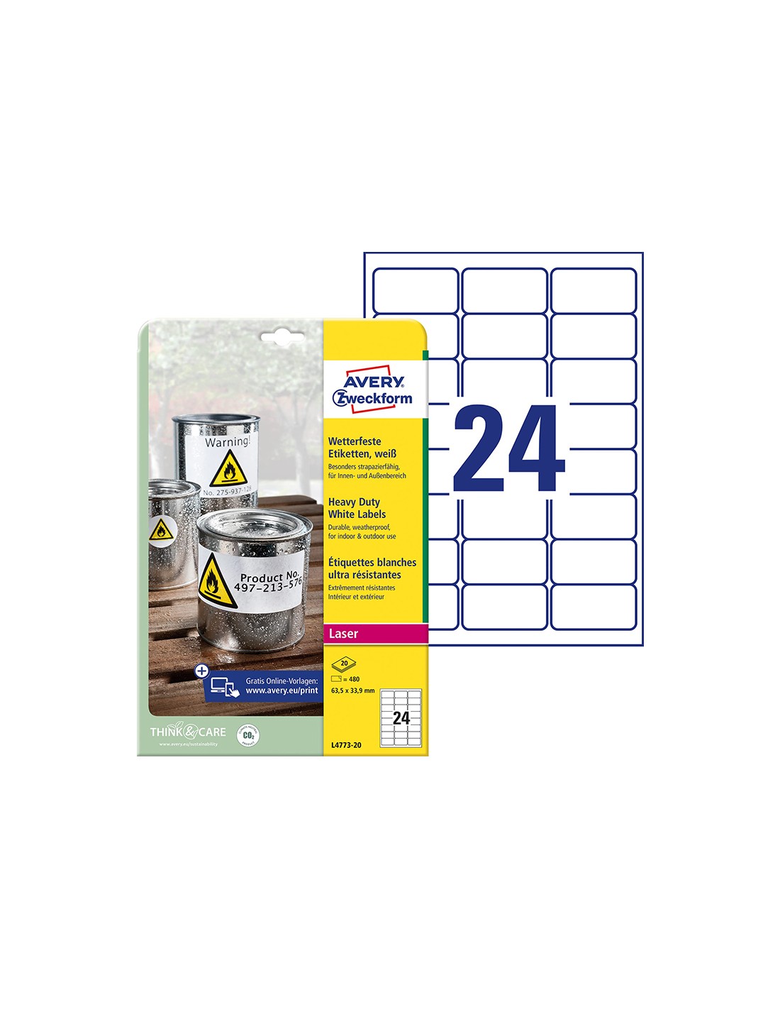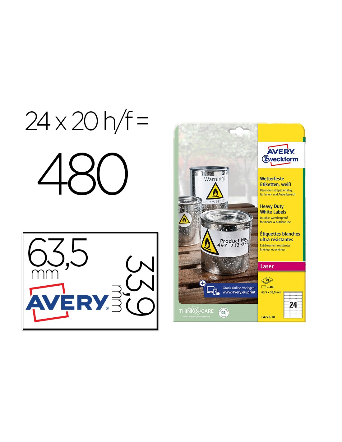 Etiquetas de poliéster resistentes a la suciedad, al aceite y al agua. Impermeables y a prueba de rotura. Resistentes a los rayos uv e inalterables a los cambios de temperatura entre -20 y + 80°c. Ideales para uso externo,no se desgarran y se pueden aplicar en metal, vidrio, plástico y madera. Para impresora láser. Adhesivo permanente. Se puede utilizar el software crea e imprime gratuito de Avery para realizar el diseño de las etiquetas con pocos clics. Caja de 20 hojas.