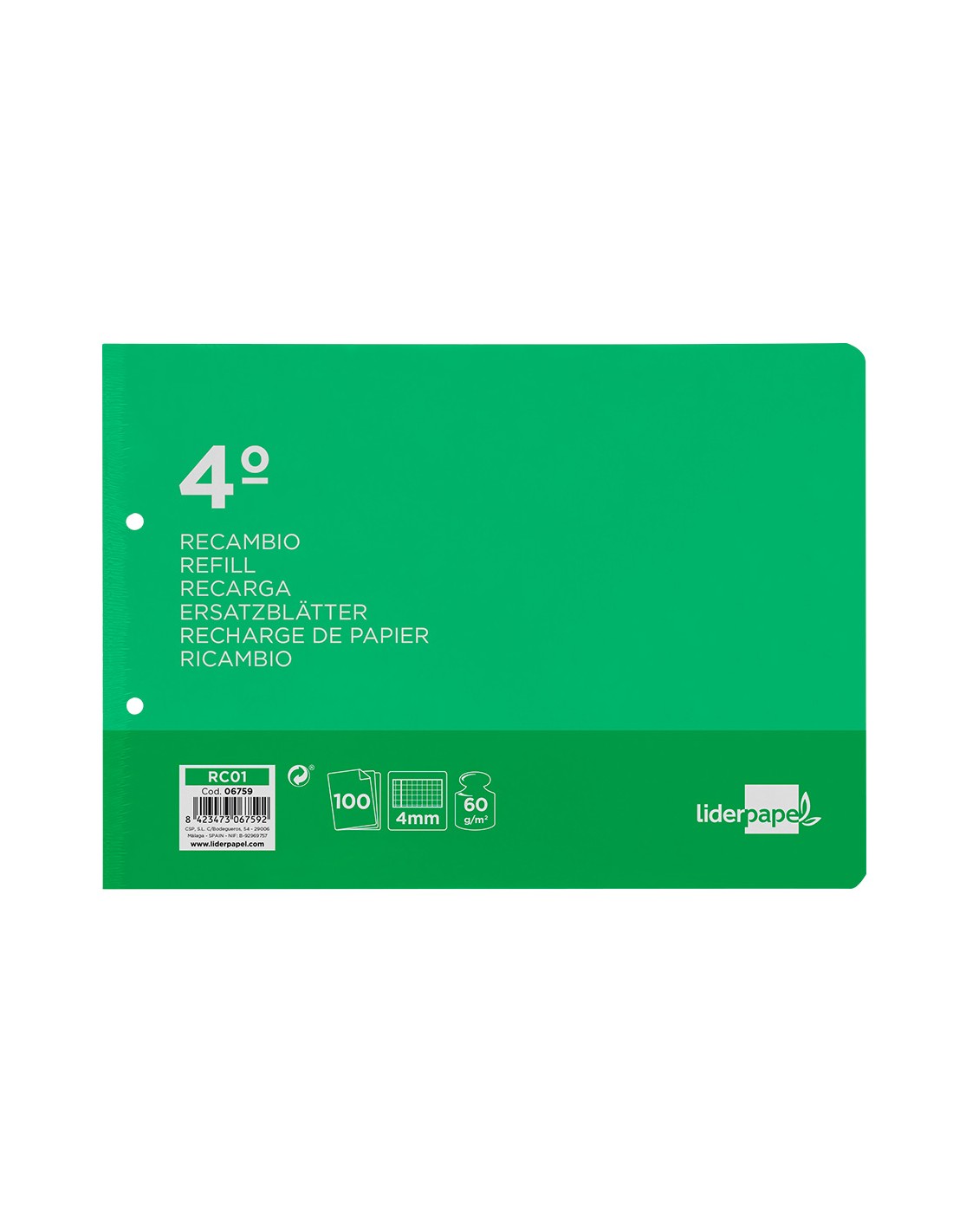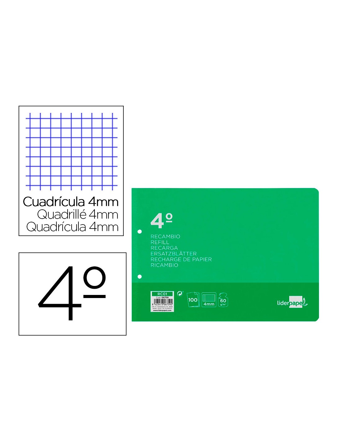 Recambio liderpapel cuarto apaisado 100 h 2tca-01 cuadro 4 mm 2 taladros con margen