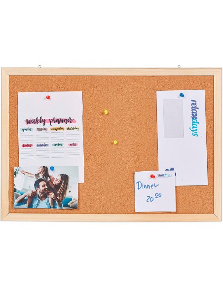 Tablero de corcho natural para notas. Corcho natural en las dos caras. Enmarcado en madera de pino natural. Incluye bolsita con 5 señalizadores. Provisto de accesorios de fijación a la pared. 5 mm de grosor del corcho.