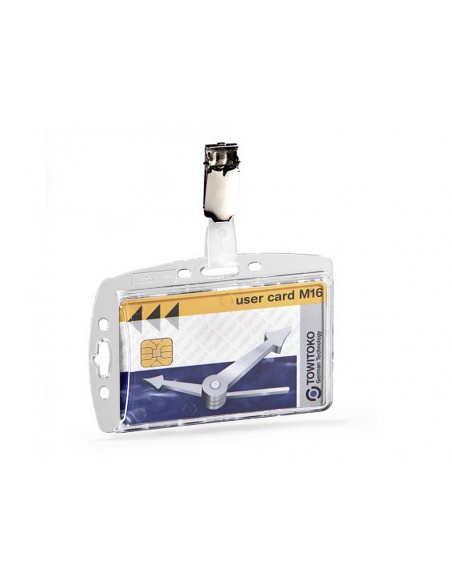 Portànoms acrílic rígid per a targetes d'identificació o passis de seguretat. Amb subjecció de pinça giratòria i ungles per extreure fàcilment la targeta. Es pot combinar amb cadenes, cintes per a portanoms i cordons extensibles. Color: transparent. Mides
