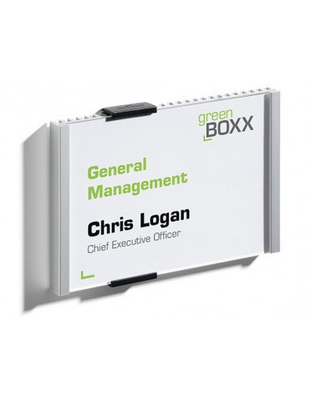 Identificador per a portes d'alumini amb plaques acríliques antireflectants. Fàcil de fixar a la paret amb la banda adhesiva o els cargols adjunts. Les plantilles d'impressió es descarreguen gratuïtament de la pàgina web www. DURABLE.eu. Inclou cartolina,