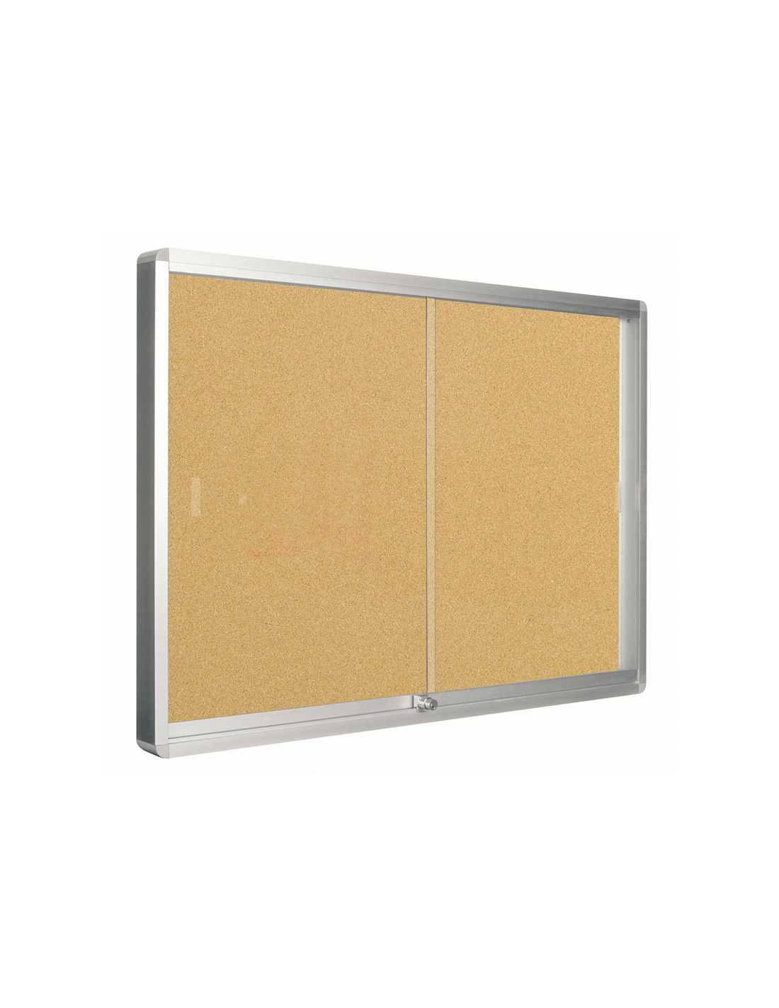 Amb fons de suro, construïda en alumini anoditzat. Portes corredisses de vidre de seguretat antiruptures de 5 mm de gruix i pany amb 2 claus. Proveïda d'accessoris de fixació a la paret. Cantoneres arrodonides. Porta de vidre. Fons: 6 cm.