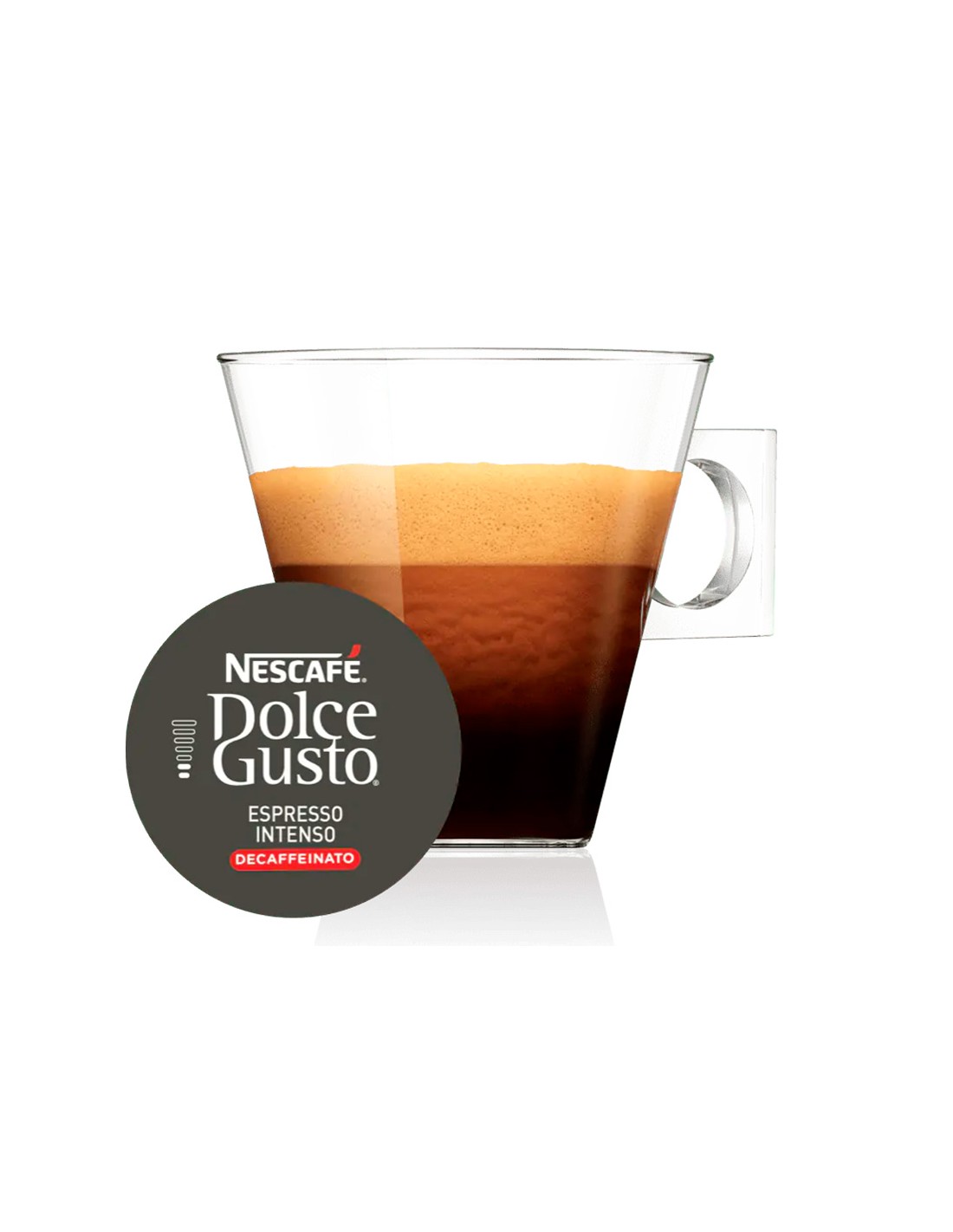 Cápsulas Espresso Nescafé Dolce Gusto Descafeinado intenso selección arábica y robusta de Colombia y Vietnam. Intensidad 7. La mejor manera de saborear un espresso 100% arábica sin cafeína. Intenso aroma manteniendo todo su cuerpo y sabor gracias al proceso natural de descafeinización con agua. Sólo válida para las máquinas de café Dolce Gusto. Caja de 16 unidades.