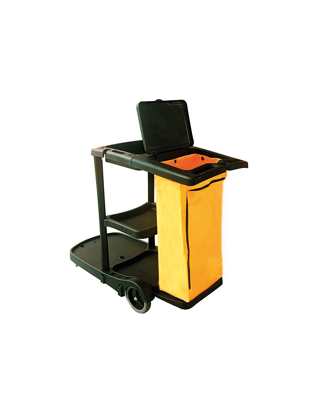 Fabricado en polipropileno. Con ruedas para un fácil desplazamiento. Bolsa con cremallera para poder sacar más fácilmente la bolsa de la basura. Dos estantes para depositar los artículos de limpieza. Plataforma para soporte del cubo de la fregona. Medidas 58 x 24 x 96 cm.