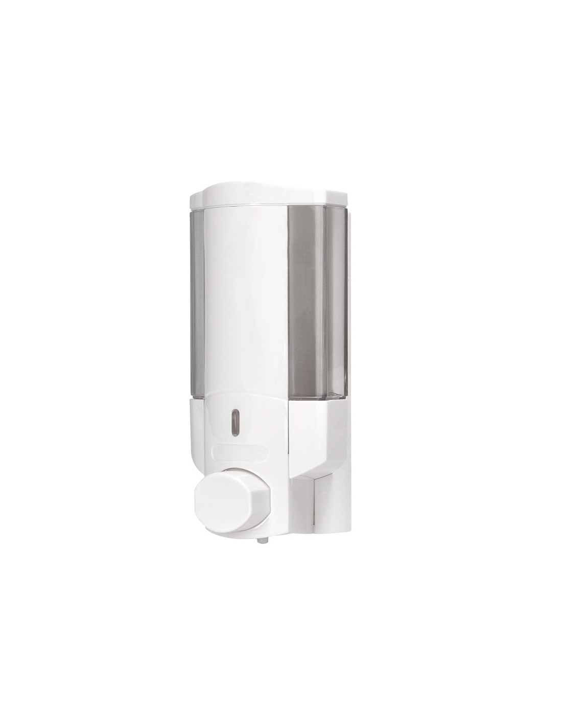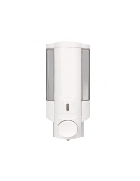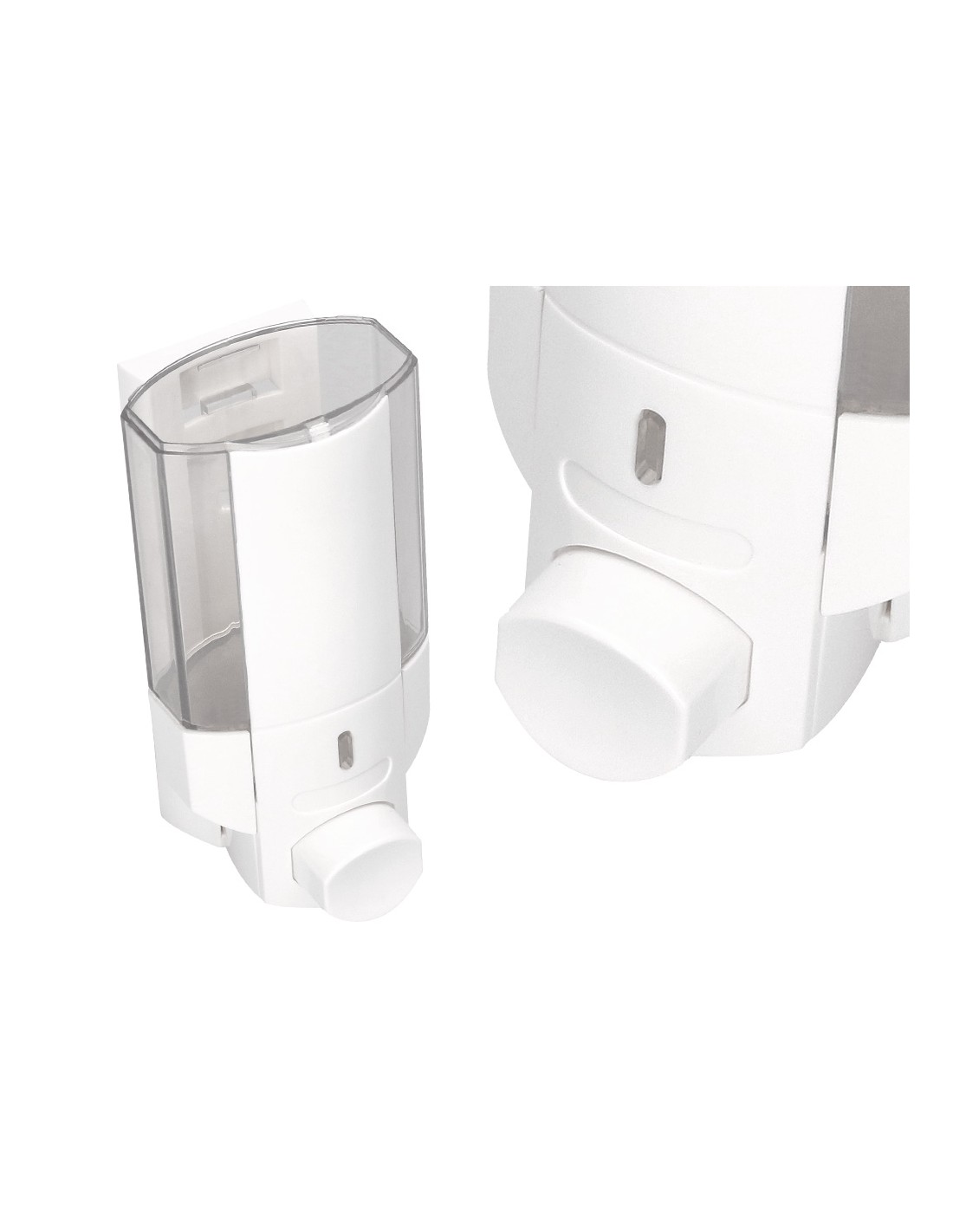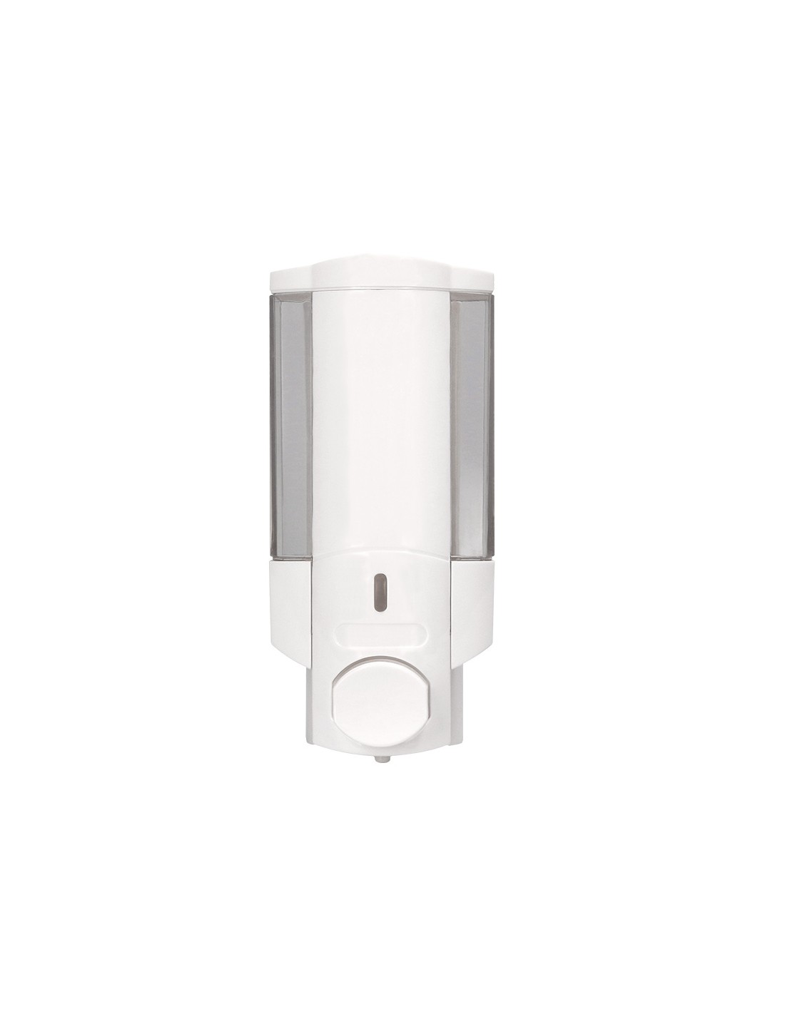 Dispensador manual, con visor azul transparente que permite ver el nivel de jabón. Color blanco. Capacidad 350 ml. Medidas 80 x 90 x 190 mm.