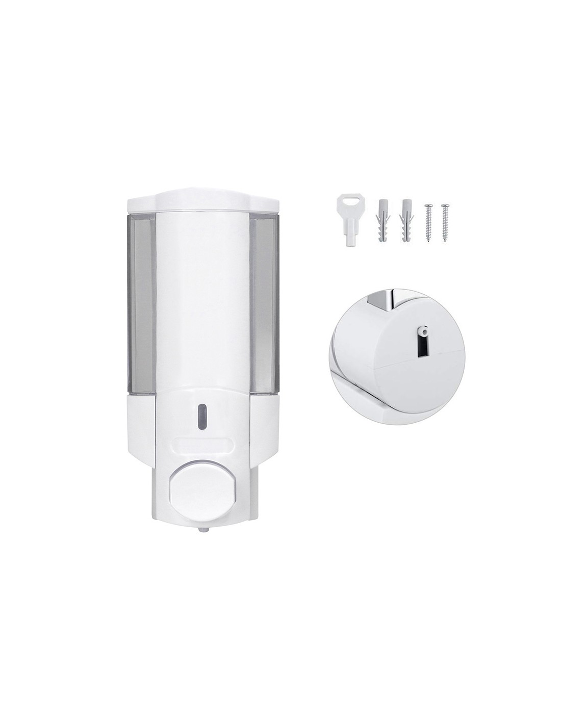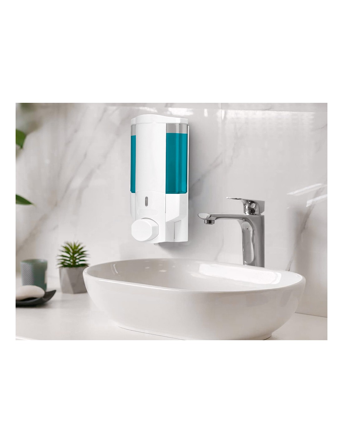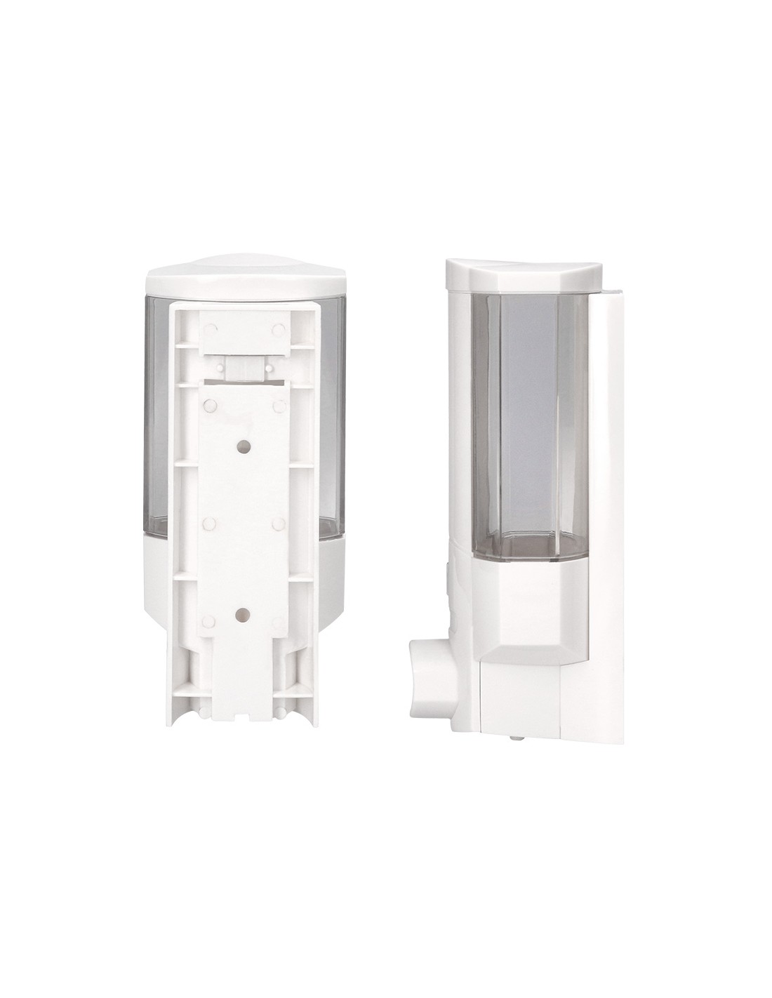 Dispensador manual, con visor azul transparente que permite ver el nivel de jabón. Color blanco. Capacidad 350 ml. Medidas 80 x 90 x 190 mm.